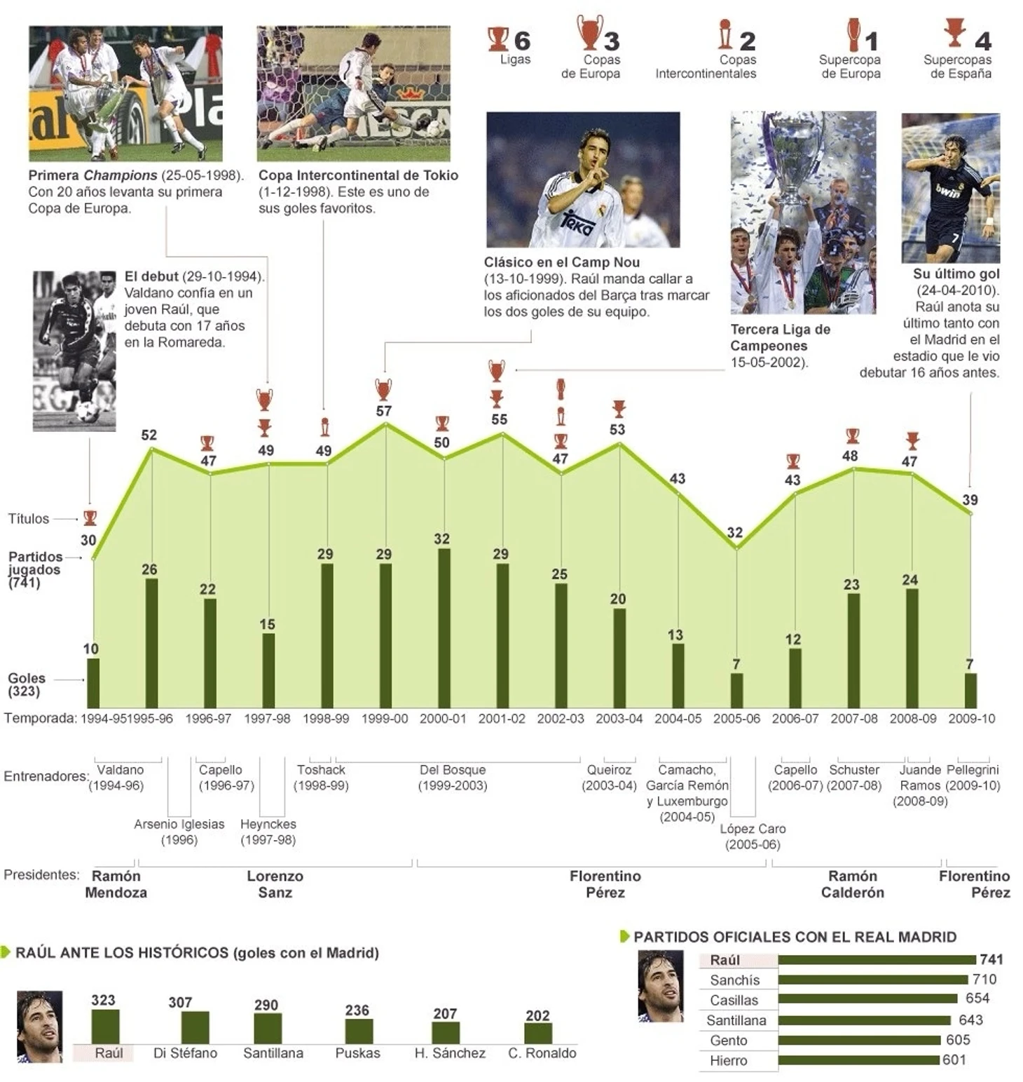 Рауль только что завершил 16-й сезон в «Реале». За все это время он сыграл в общей сложности 741 матч, забив 323 гола, которые распределяются следующим образом: 550 матчей в Ла-Лиге, в которых он забил 228 голов; 132 матча в Лиге Чемпионов с 66 голами; 37 матчей в Кубке Испании с 18 голами; 12 матчей в Суперкубке Испании, в которых он забил 7 голов; 3 матча в Суперкубке Европы с 1 голом; еще 3 матча в Межконтинентальном кубке с еще одним голом; 4 матча на клубном чемпионате мира с 2 голами. За короткое время пребывания в молодежной структуре клубе он сыграл 9 матчей за «Реал Мадрид Б» и «Реал Мадрид С», забив 15 голов.