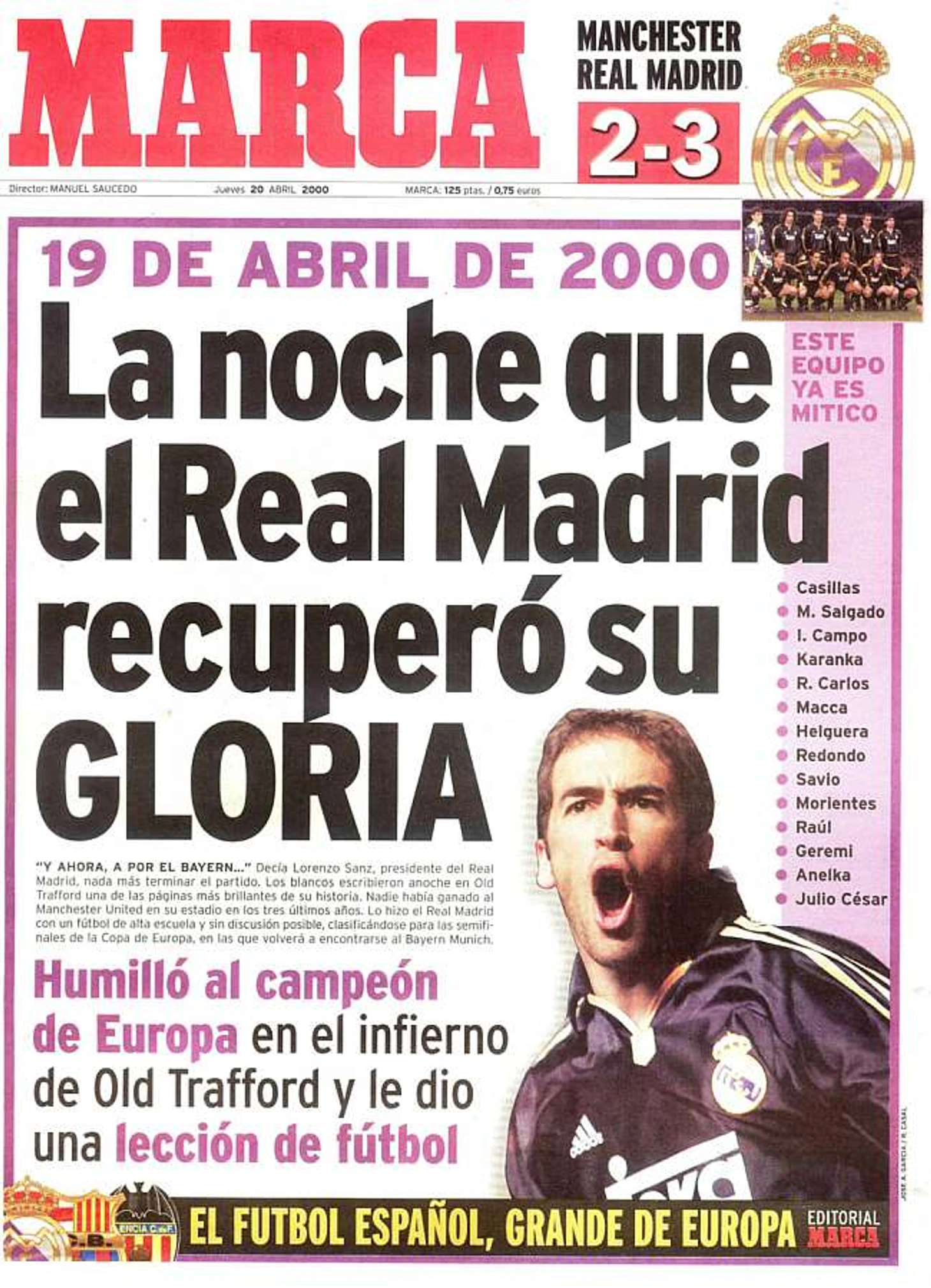 Без Тошака клуб окончательно делает ставку на Висенте Дель Боске, спокойного и безмятежного человека клуба, который знает всех молодых игроков, который был образцом футболиста и придал проекту оттенок абсолютной нормальности. Дель Боске продолжает очередной нестабильный сезон в лиге и максимально использует возможности команды в Лиге Чемпионов в плей-офф, которые укрепляют престиж и лидерство «Реала» и Рауля. Как, например, в матче четвертьфинала против мощного «Манчестер Юнайтед». В первом матче на «Бернабеу» 4 апреля 2000 года была нулевая ничья. Пятнадцатью днями позже «Реал Мадрид» отправляется на «Олд Траффорд» в качестве полнейшего аутсайдера, не имея никаких шансов на проход дальше. В «Театре Мечты», как называют стадион в Манчестере, выделяется фигура Рауля, который забивает два гола в отличной игре, в сопровождении феноменального Фернандо Редондо, который играет главную роль в неповторимом перфомансе при третьем голе. Аргентинец, зажатый между двумя соперниками и краю штрафной, вырывается финтом пяткой, поднимает голову и подает на гол Рауля. Английская публика увидела представление. «Реал Мадрид» выиграл со счетом 2-3, вышел в полуфинал и «нокаутировал» еще одну великую команду – «Баварию». Обложка Marca (19 апреля 2000 г.), посвященная славной ночи на «Олд Траффорд», включает следующий заголовок: «Ночь, когда «Реал Мадрид» вернул себе славу». В ней, включающей большую фотографию Рауля, говорится: «Он унизил Чемпиона Европы в аду «Олд Траффорда» и преподал ему урок футбола».