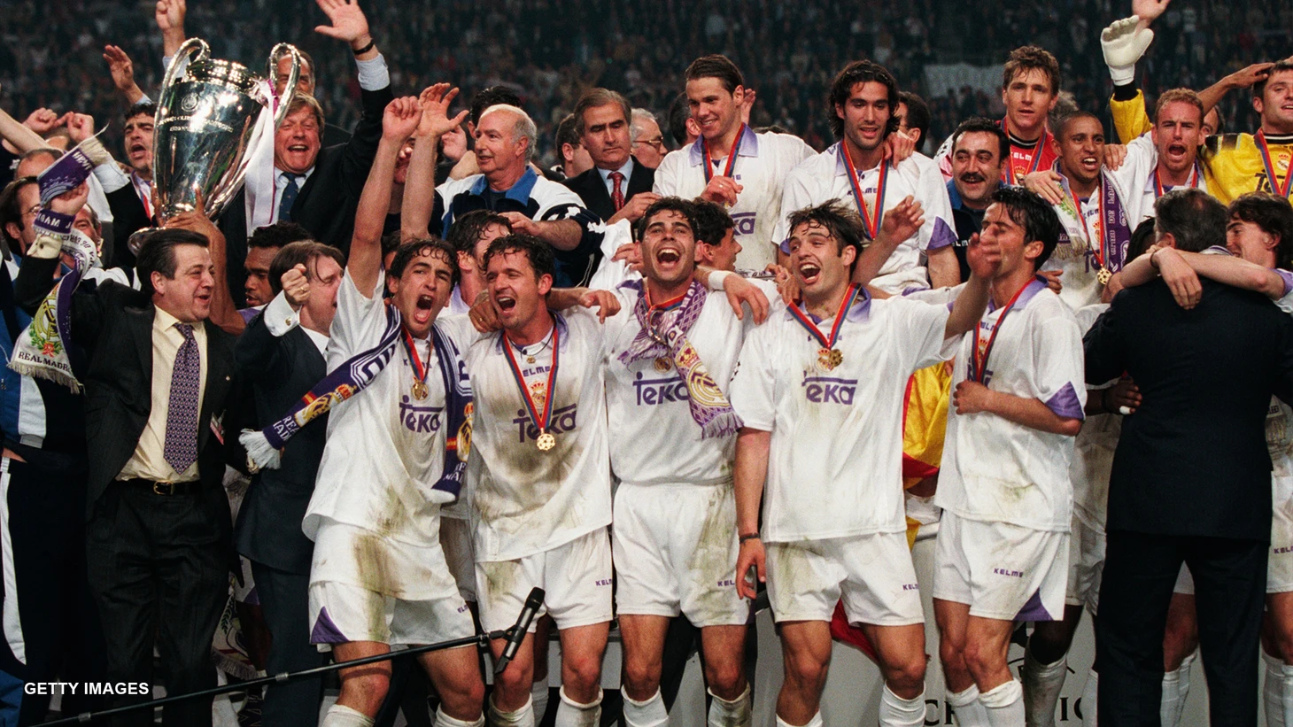 Хайнкес, его ассистенты, врачи, физиотерапевты, запасные... Вся команда обнимает друг друга, некоторые плачут, многие прыгают, кричат... Половина стадиона пуста. Итальянские болельщики ушли. Другая половина «Амстердам-Арены», заполненная флагами Испании и «Реала», отмечает. Наступил момент, которого больше всего ждали болельщики «Реала». Капитан Санчис получает «ушастый» трофей Лиги Чемпионов и поднимает его над головой. Рауль не прекращает прыгать и петь. Он побежал с огромным трофеем с бешеной скоростью, недосягаемый для своих товарищей. С трибун падают белые шарики, и Рауль начинает играть одним из них, пока не отправит его головой в те самые ворота, куда Миятович забил гол. Это вызывает восторг на трибунах. Рауль удивляет всех, когда надевает плащ тореадора. Приготовьте «оле», которые теперь будут звучать на всех празднованиях. У кромки поля, взволнованный и с шарфом, повязанным на лбу, он комментирует: «Спасибо футболу за то, что я проживаю эти моменты. Я самый счастливый на свете». И он кричит: «Мы едем на Сибелес! ¡Hala Madrid!».