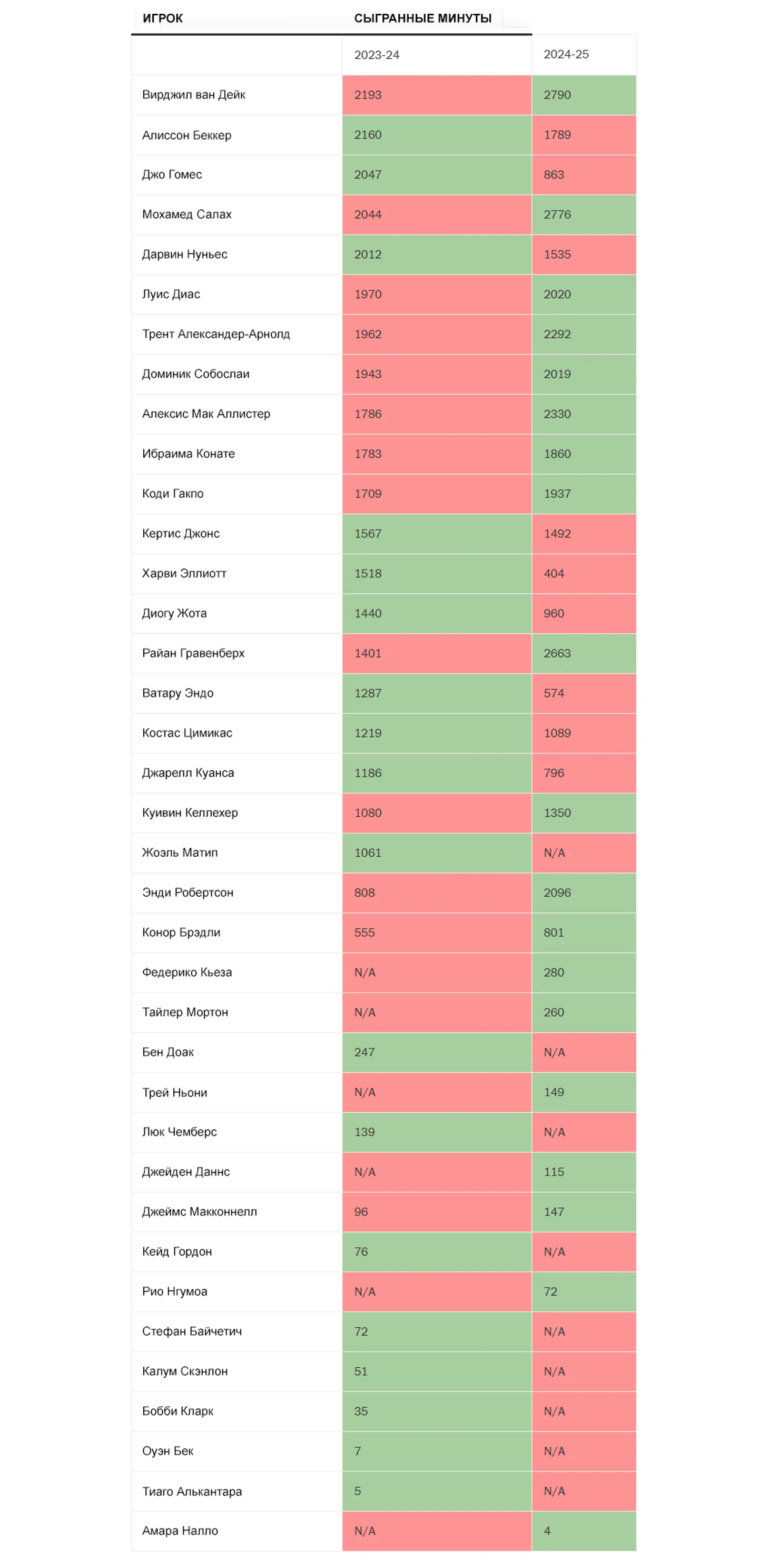 В этом сезоне Слот столкнулся с проблемой травм: Алиссон, Харви Эллиотт, Жота, Кьеза, Джонс, Александер-Арнолд, Костас Цимикас, Ибраима Конате, Брэдли и Гомес длительное время находились вне игры.