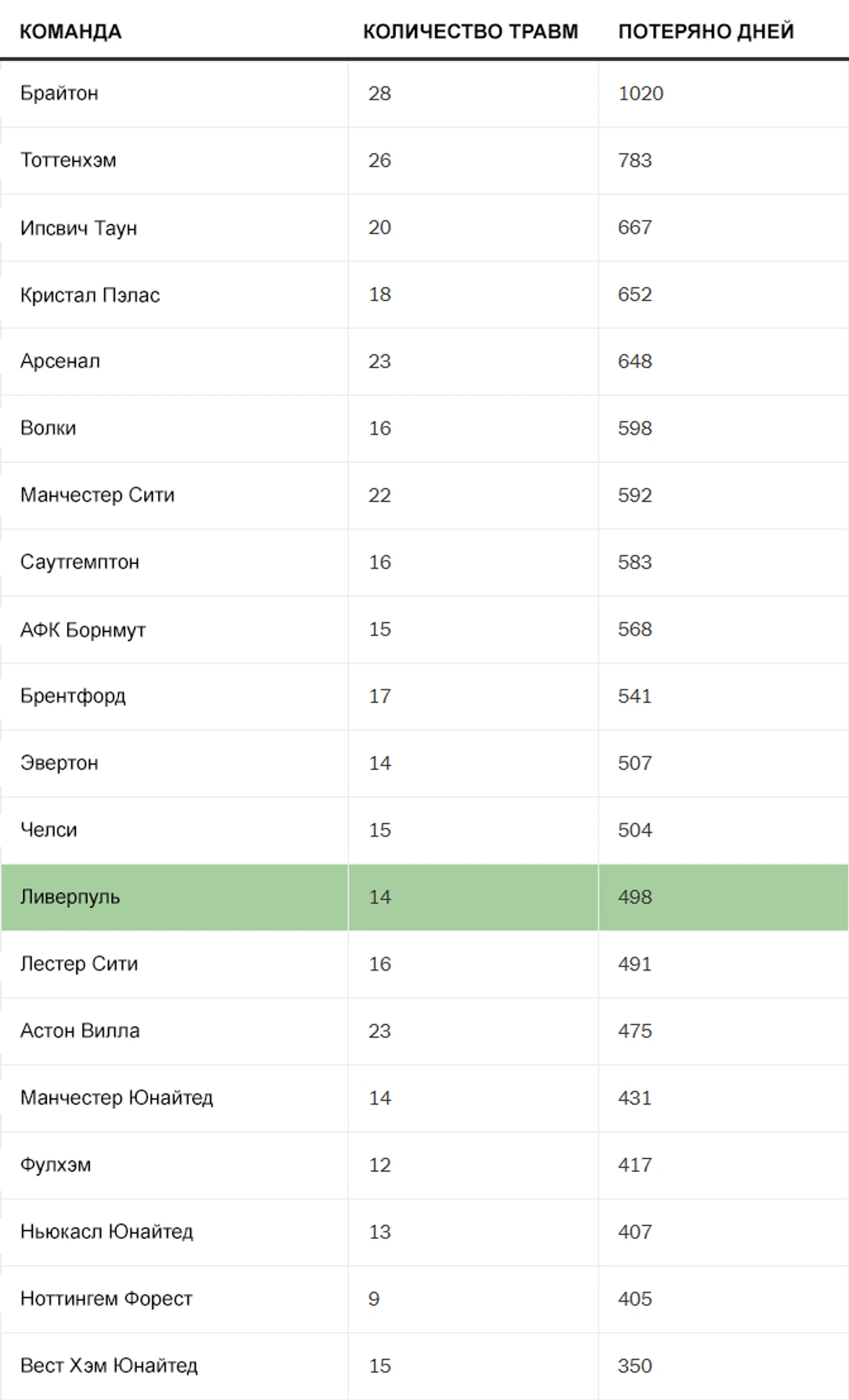 По данным сайта Premierinjuries.com, на том же этапе прошлого сезона «Ливерпуль» получил 19 травм с потерей времени (травма, из-за которой игрок выбывает как минимум на один матч Премьер-лиги), в то время как в этом сезоне таких травм 14.