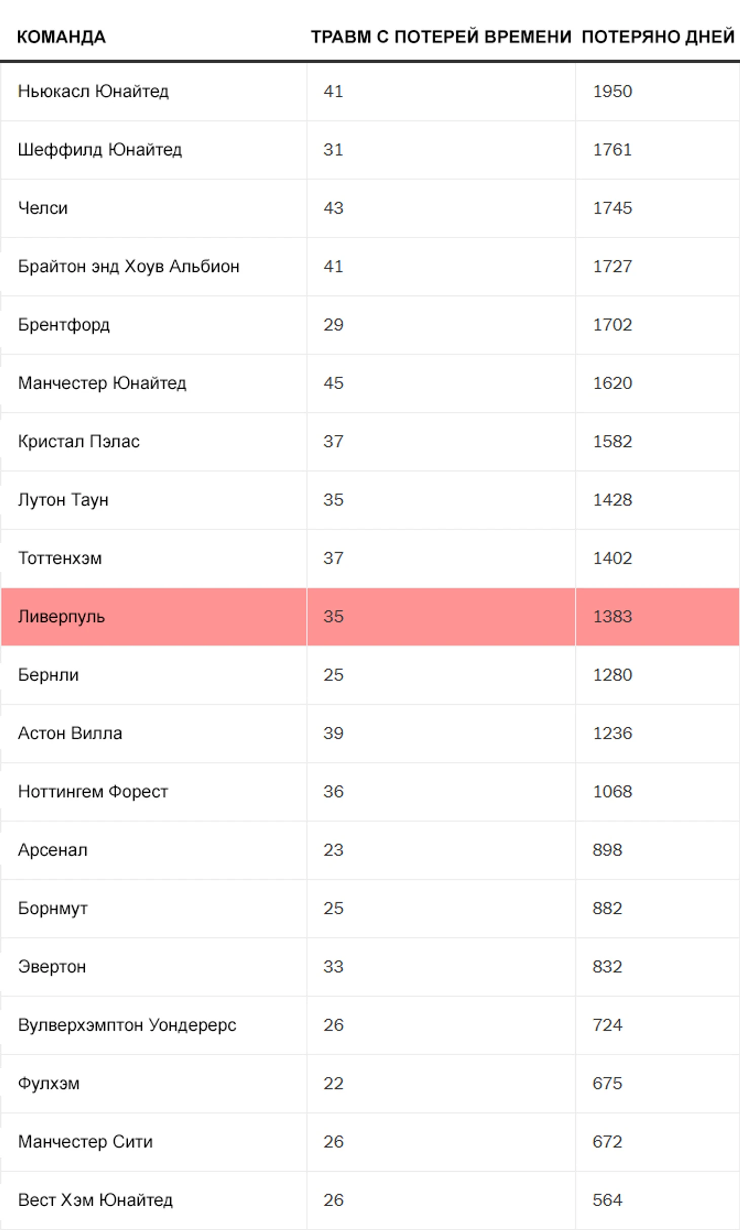 Это произошло как раз перед тем, как у «Ливерпуля» случилась самая тяжелая история с травмами в своей кампании. К концу сезона они были в середине группы по количеству дней, потерянных из-за травм, но проблема заключалась в том, что они набрали их одновременно и их было так много.