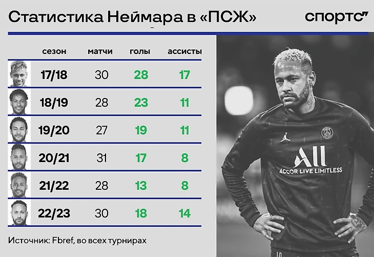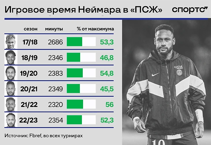 До этих конфликтов Неймар впечатлял на поле, особенно – в первом сезоне. Только в Лиге 1 настрелял 28+17 при 53,3% игрового времени. Играл нечасто из-за травм: по данным Transfermarkt, в Париже бразилец вылетел 25 раз за семь лет. Во Франции он никогда не получал более 56% от доступных минут.