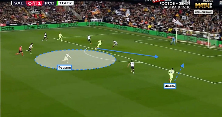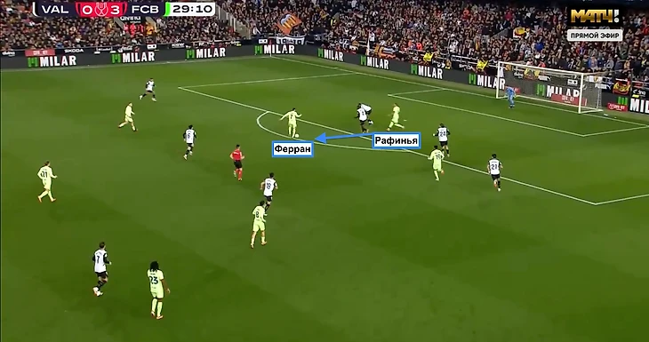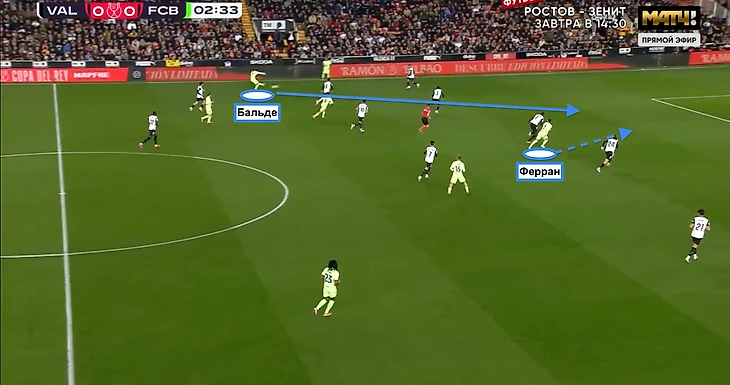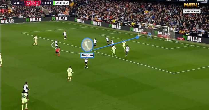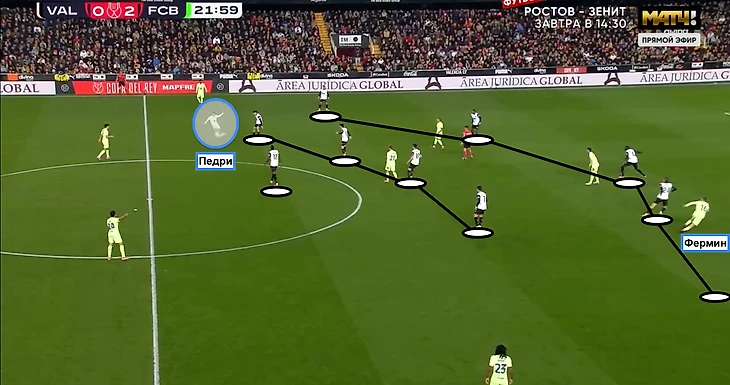 К 23 минуте встречи «Барселона» забила третий гол. И снова правосторонняя зона оборонительного блока «Валенсии». Здесь структурность 5-4-1 сохранилась, но пассивность правого крайнего полузащитника «летучих мышей» позволила Педри получить мяч и, забросом за линию обороны соперника, отдать голевую передачу на вбегающего туда Фермина Лопеса.
