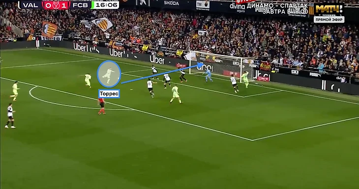 В четвертом голе «Барселоны», в третьем для Феррана Торреса, ярко бросилось в глаза пассивность опорных полузащитников «Валенсии» при передачи мяча Педри в атакующую линию каталонцев уже из левосторонней зоны оборонительного блока «летучих мышей».