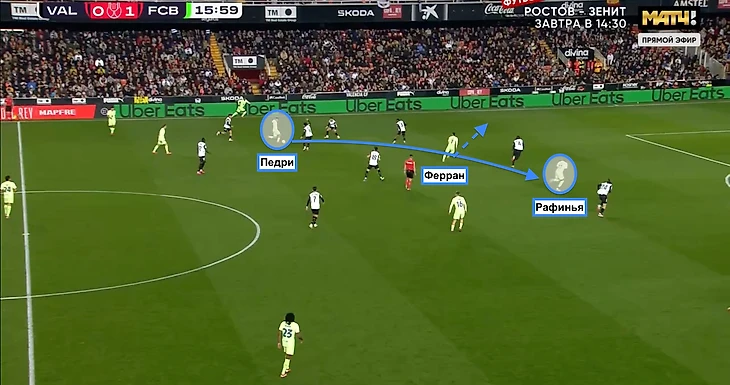 На открытом участке поля Педри передачей внешней стороной стопы нашел в центре атаки Рафинью. Отметим также и движения Феррана, который рывком на фланг растянул центр обороны, увеличив пространство для Рафиньи.