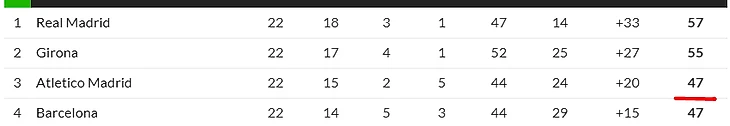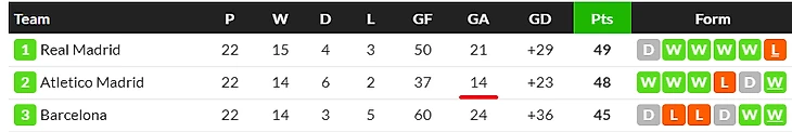 Извиняюсь за небольшое отступление, хотелось сказать пару мыслей о таком матче! Вернемся к статистике. Я, скорее всего, многих удивлю, сказав, что Атлетико после 22 туров набрал всего на 1 очко больше по сравнению с прошлым сезоном (48 против 47). Тогда, казалось бы, какой разговор о титуле? Все мы помним, что в том сезоне Атлетико занял 4-е место, что непозволительно при Симеоне.