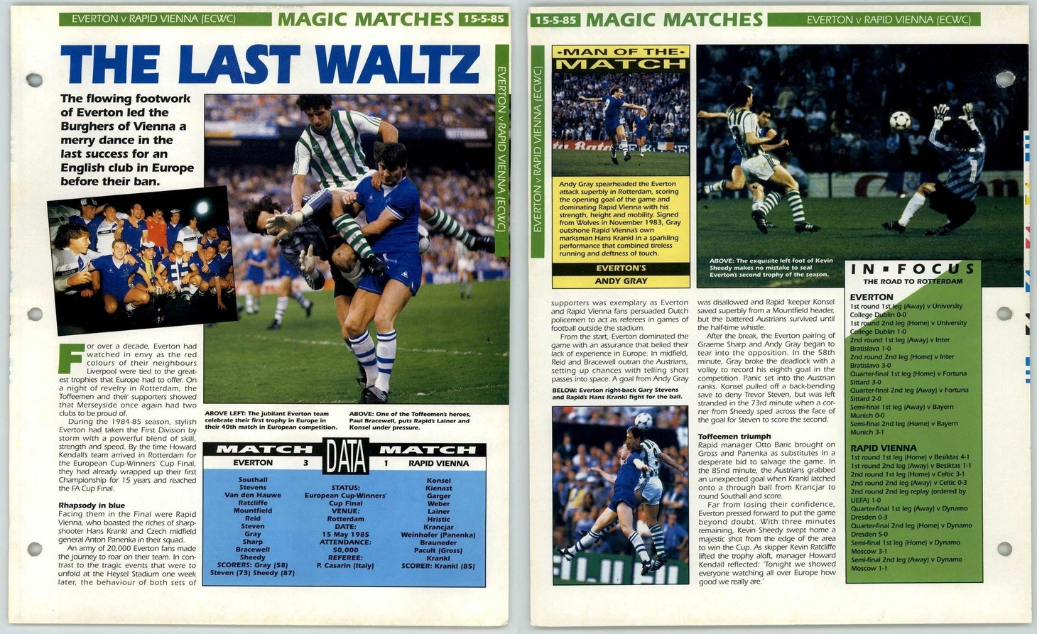 К началу сезона-84/85 сокровищница «ирисок» была наполнена 7 чемпионскими титулами, 4 Кубками Англии и 5 Коммьюнити Шилдами. Суммарно 16 трофеев. Неплохо. Более того, «Эвертон» ровесник МЮ и старше своих земляков, носящих имя города; «красные» ведут свою летопись лишь с 1893 г. Однако вплоть до 1985 г., «синие» о победах в еврокубках могли только мечтать; «Ливерпуль» к тому времени уже брал КЕЧ и рубился за Межконтинентальный Кубок. «Эвертон» на евроарене находился в тени. Да и во внутреннем первенстве доминация «красных» была куда солиднее. Так сложилось, что как победитель Кубка Англии сезона 1983/84 «Эвертон» попал в Кубок Кубков и смог конвертировать свой успех год спустя в нечто куда большее.