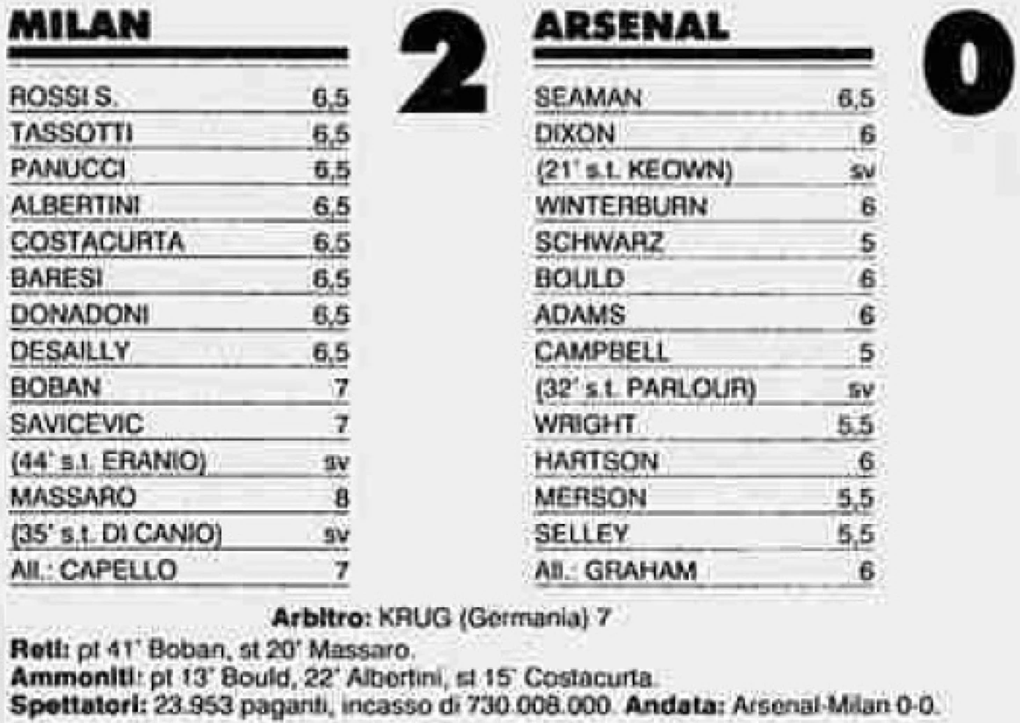В составе “Милана” блистала плеяда легенд: Франко Барези, Паоло Мальдини, Марсель Десайи, Роберто Донадони и, конечно же, Даниэле Массаро. “Арсенал” также мог похвастаться звездным составом: Дэвид Симэн, Ли Диксон, Тони Адамс, Иан Райт и Пол Мерсон.