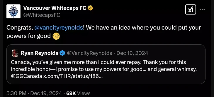 «У нас есть идея, куда бы вы могли направить свою энергию», – обратился «Ванкувер» к Рейнольдсу в соцсетях.