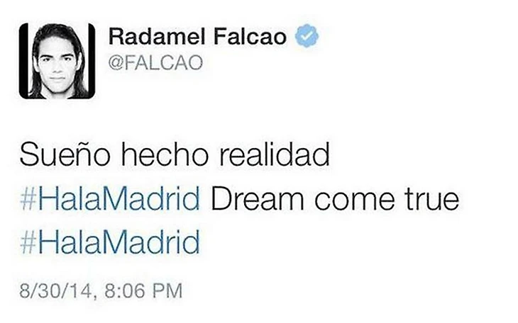 Нет, речь не об очередном голе. Просто в соцсетях колумбийца появился твит: «Мечта сбылась. Хала Мадрид».