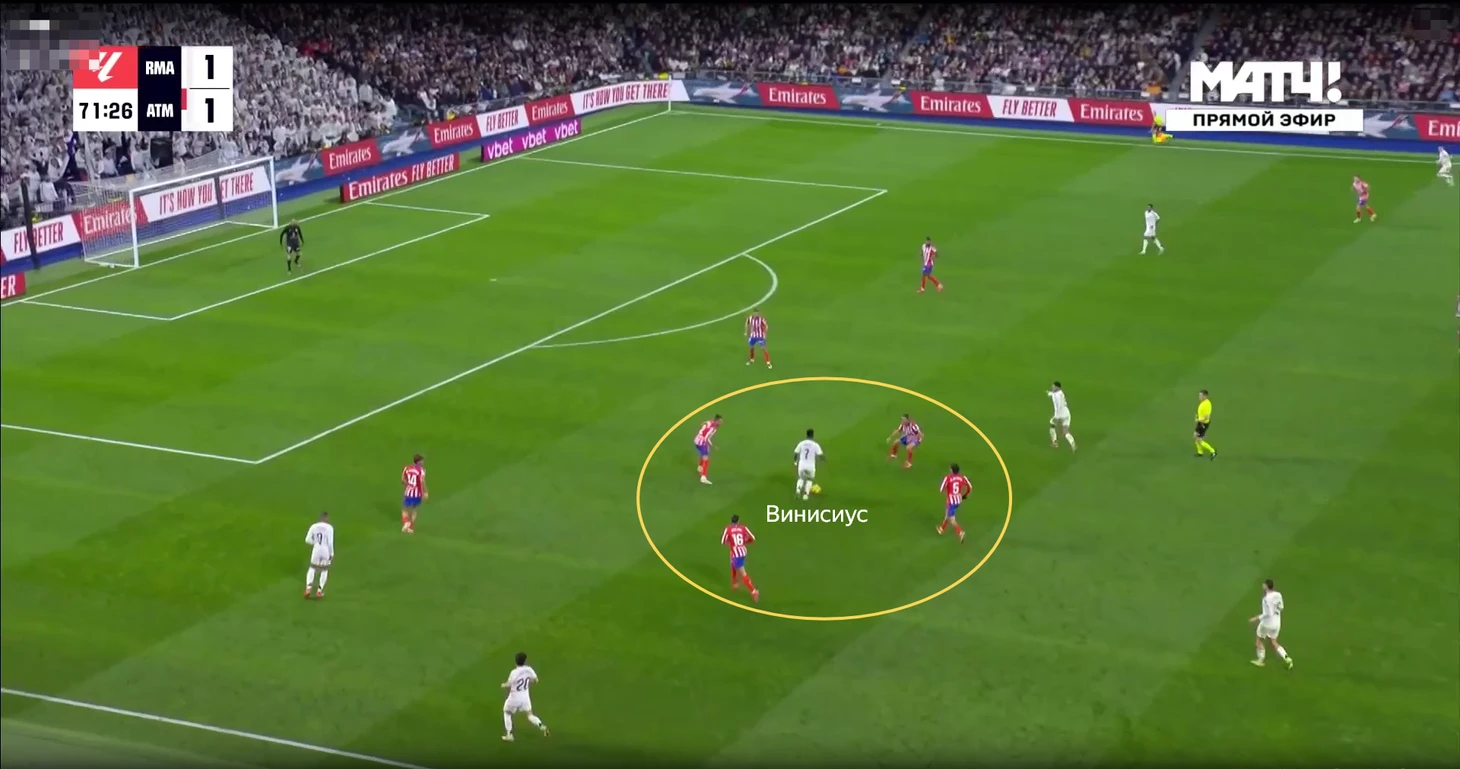 Здесь Винисиус собрал на себе много игроков соперника в полуфланге и за счёт дриблинга вошёл в штрафную и сам создал себе момент.