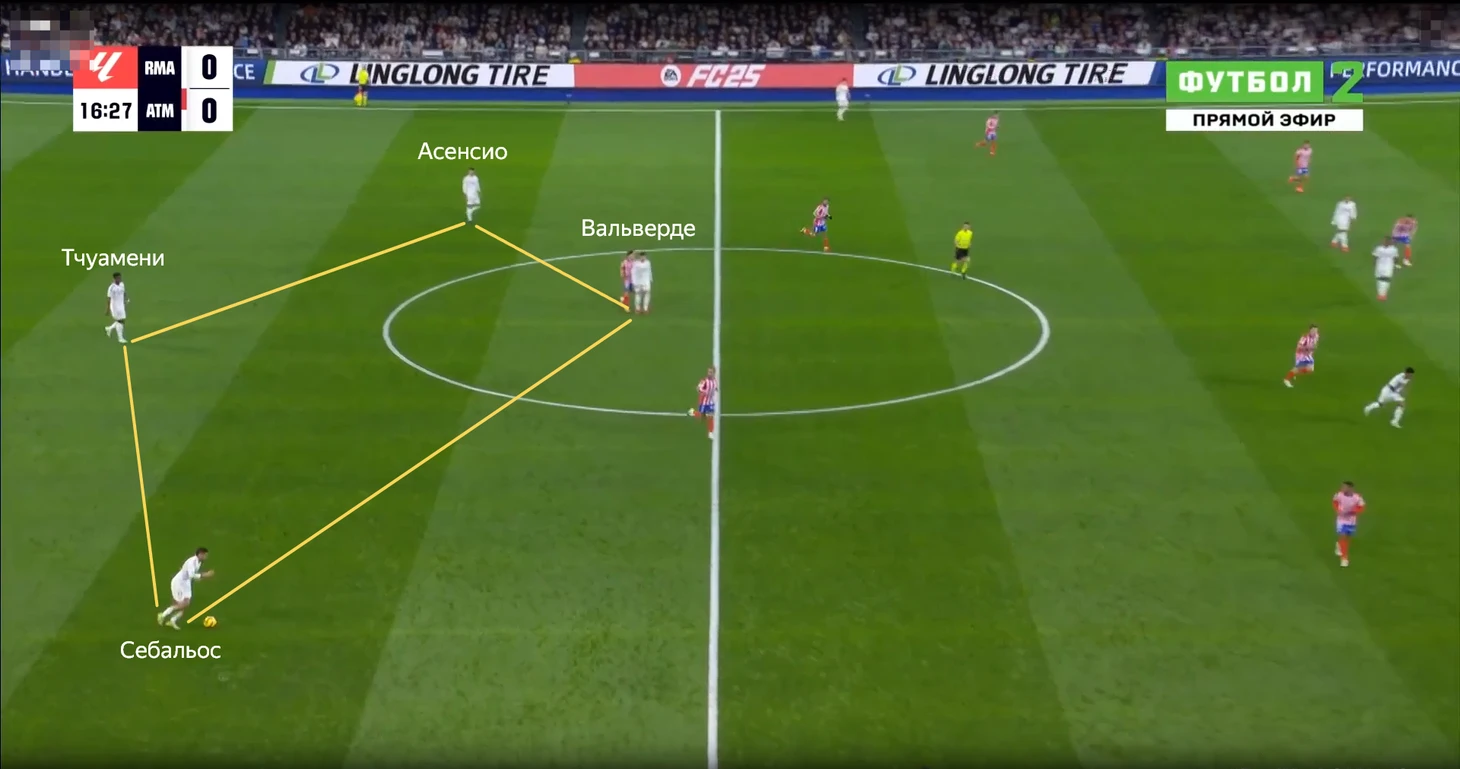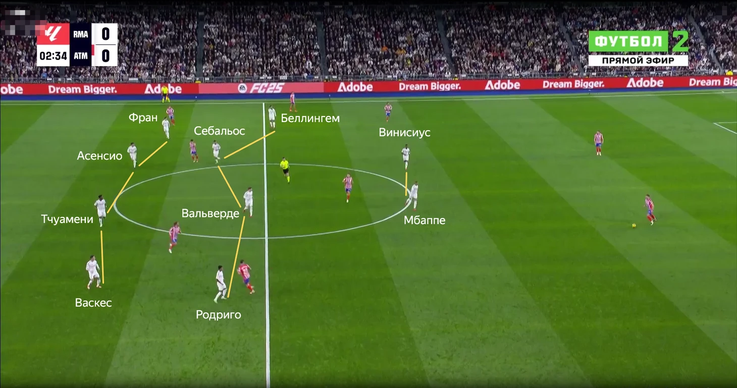 До перерыва хозяева действовали слишком стерильно без каких-либо реально опасных действий у чужих ворот. С мячом у «Мадрида» формировался ромб в начальной стадии атаки: Себальос опускался к центральным защитникам, Вальверде располагался в опорной зоне. Крайние защитники действовали выше.