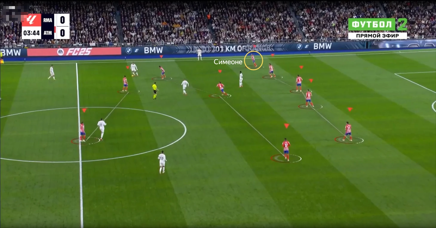 Перед матчем Диего Симеоне шутил (отчасти), что его команда приедет на дерби на «автобусе». В целом можно спорить о радикальности оборонительного плана, но фактически «Атлетико» строил свою игру преимущественно вокруг действий без мяча.