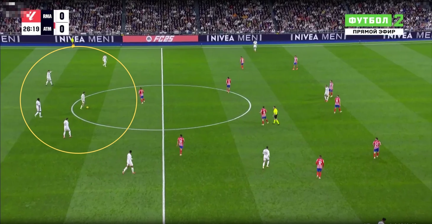 В первую очередь можно было манипулировать игроками «Мадрида» в первой линии прессинга: за счёт розыгрышей вытягивать их на себя, а затем отрезать эту группу игроков и выходить на свободное пространство.