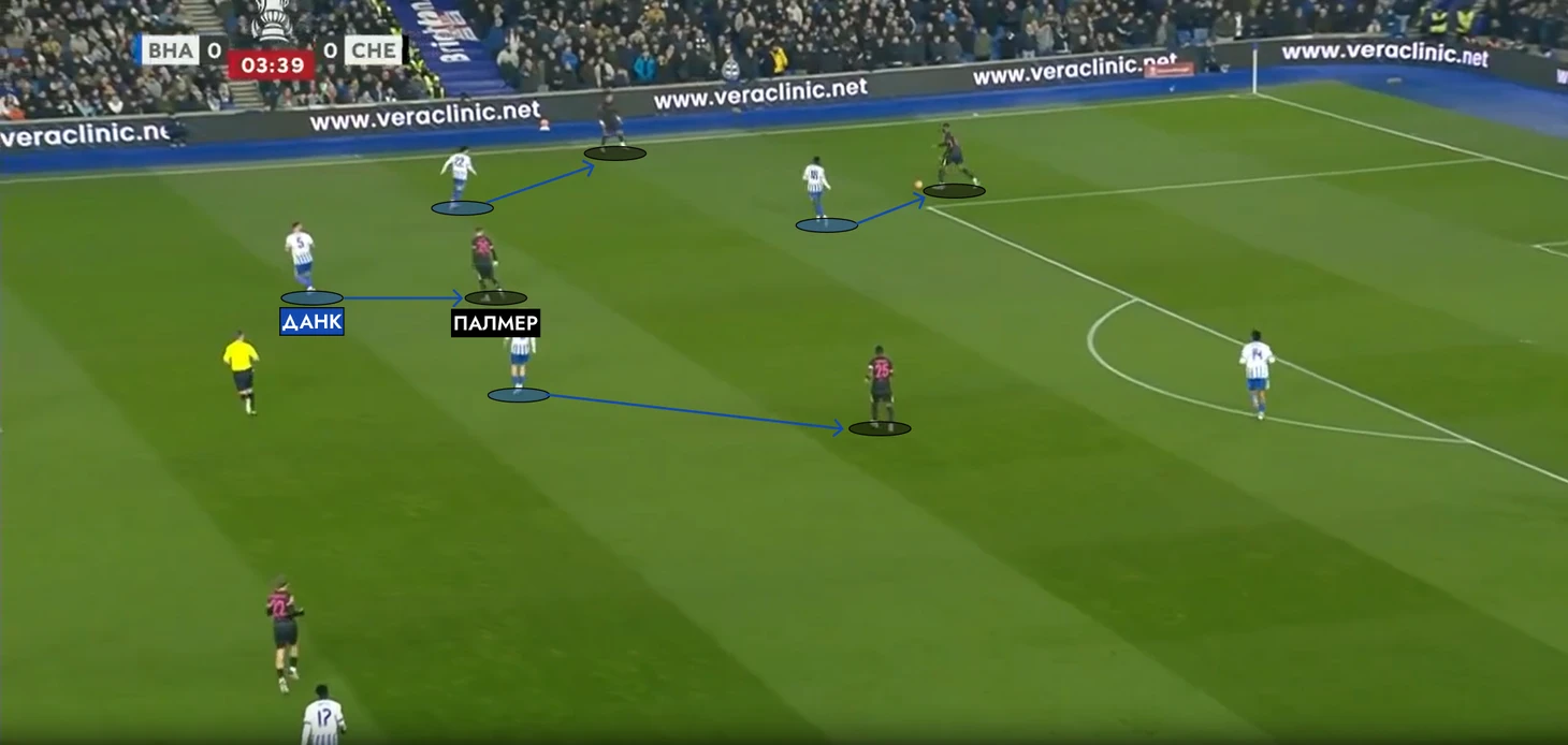 Но буквально в следующем выходе из обороны, «Брайтон» решил вопрос с прессингом Палмера – по англичанину стал играть Балеба, а Минте стал лавировать между Кукурельей и КДХ. В итоге, Данк не выдергивался вперед, а значит, «чайки» не получали ситуации «1 в 1» в своей защите.