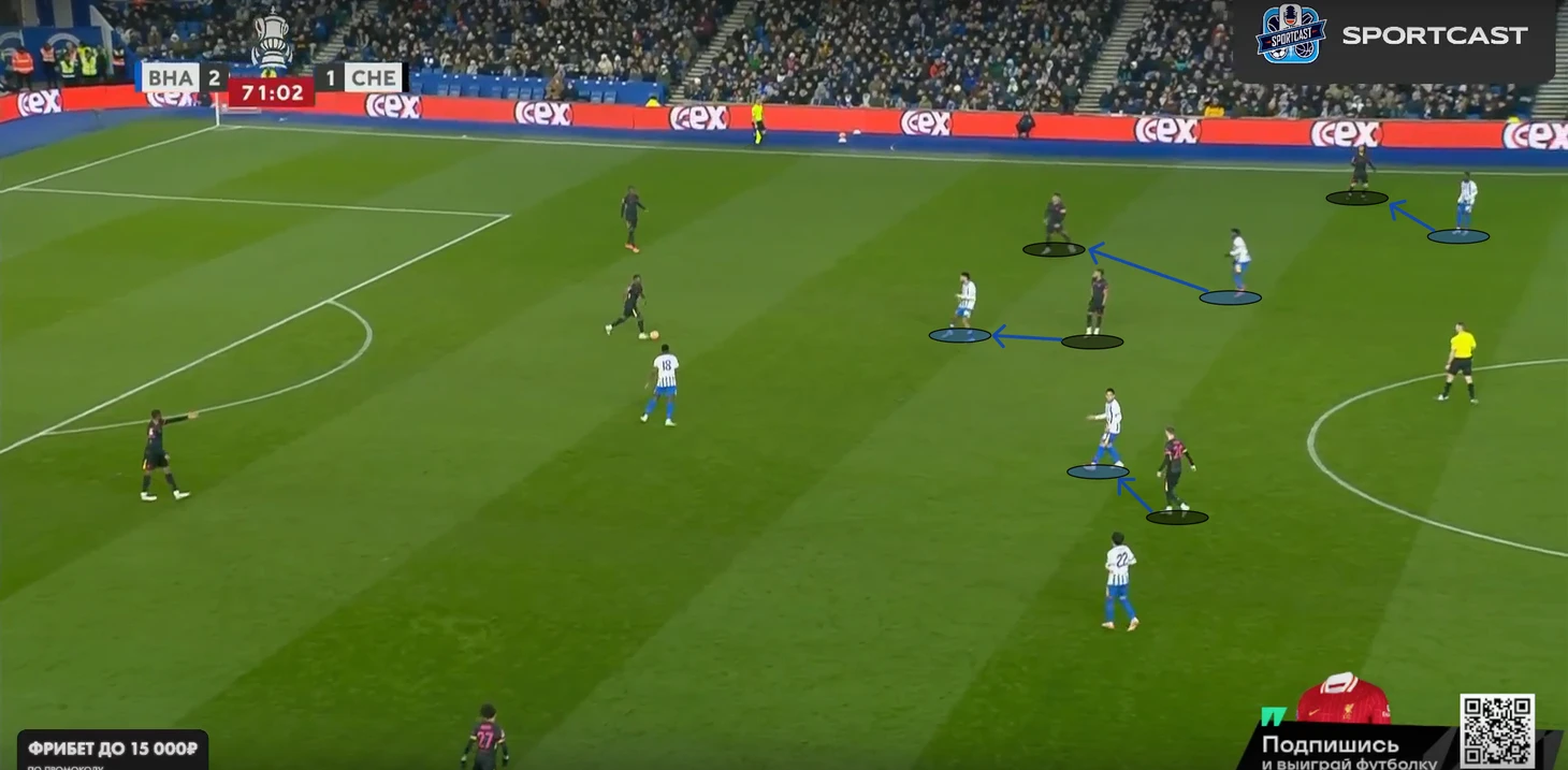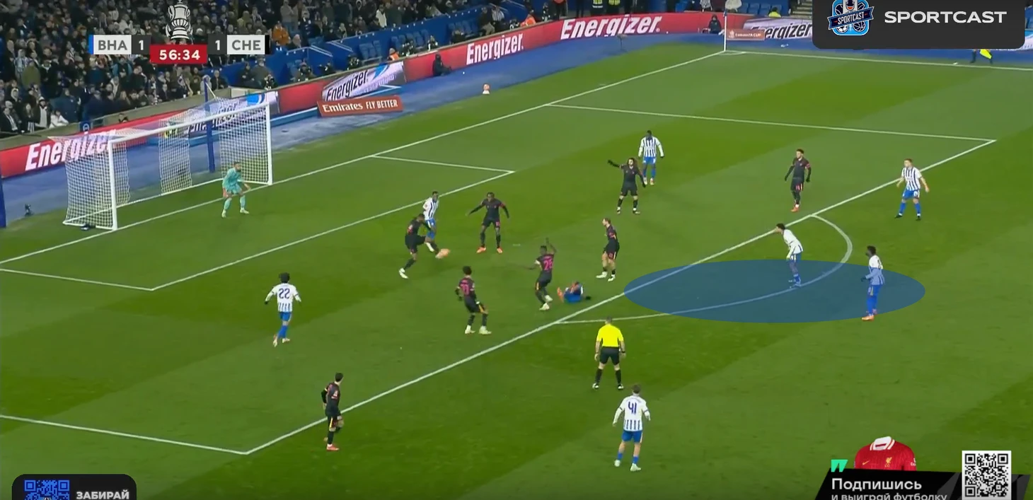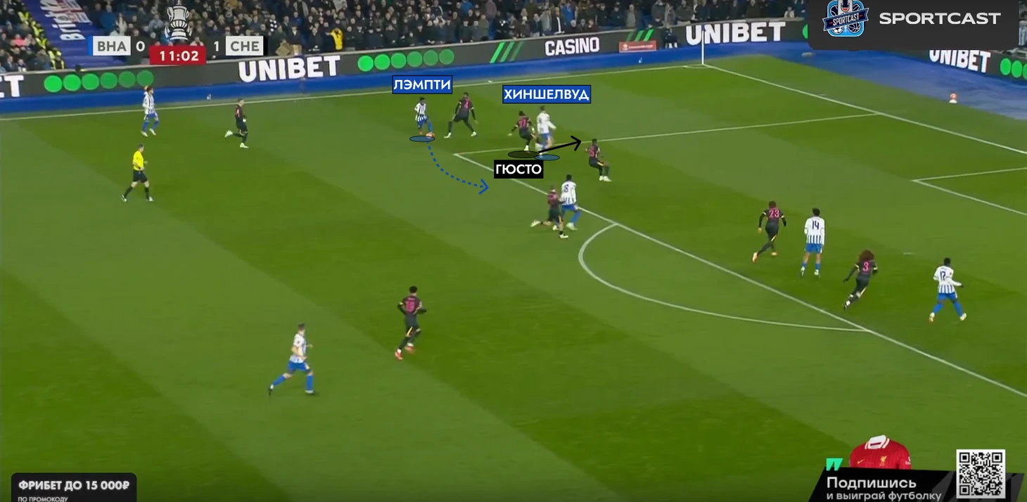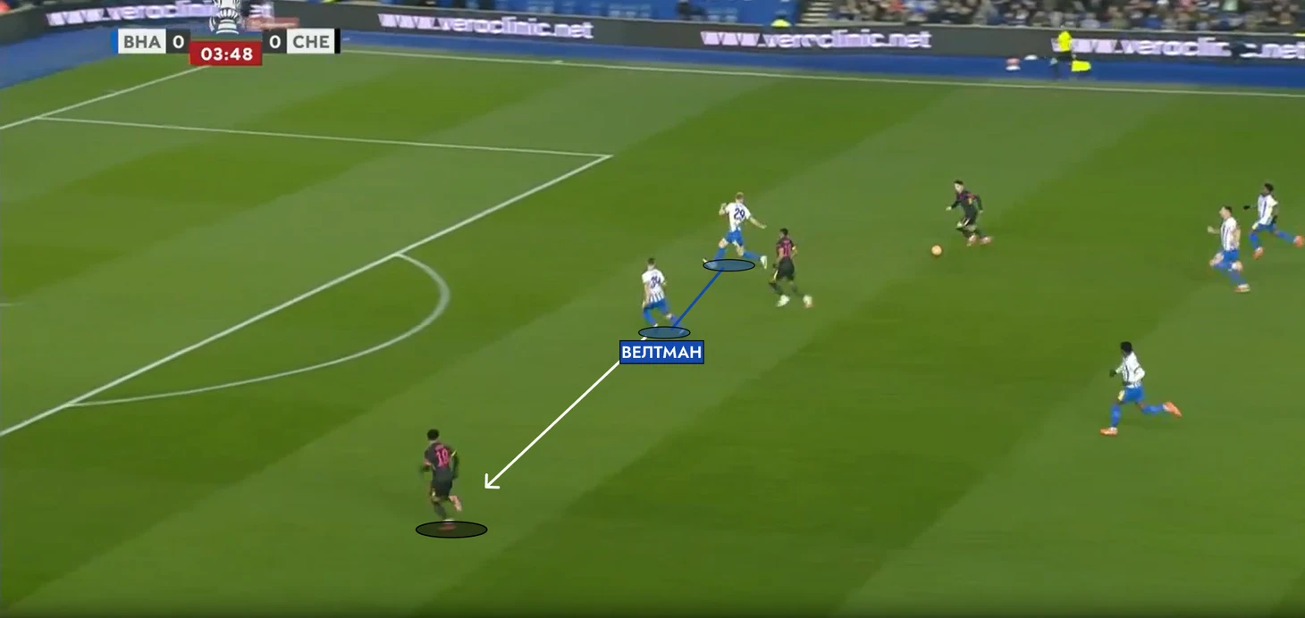 Ранний гол «Челси» не выходил из системный структуры, но был связан напрямую с хорошим выходом из-под прессинга. «Синие» не использовали инвертированную роль одного из фуллбеков в ранней стадии атаки, предпочитая розыгрыш с помощью широких краев. На это «Брайтон» отвечал высоким прессингом вингеров – Митома и Минте играли по Гюсто и Кукурелье. В опорной зоне оставался один Кайседо, и на помощь к нему подключались Палмер и Дьюзбери-Холл.