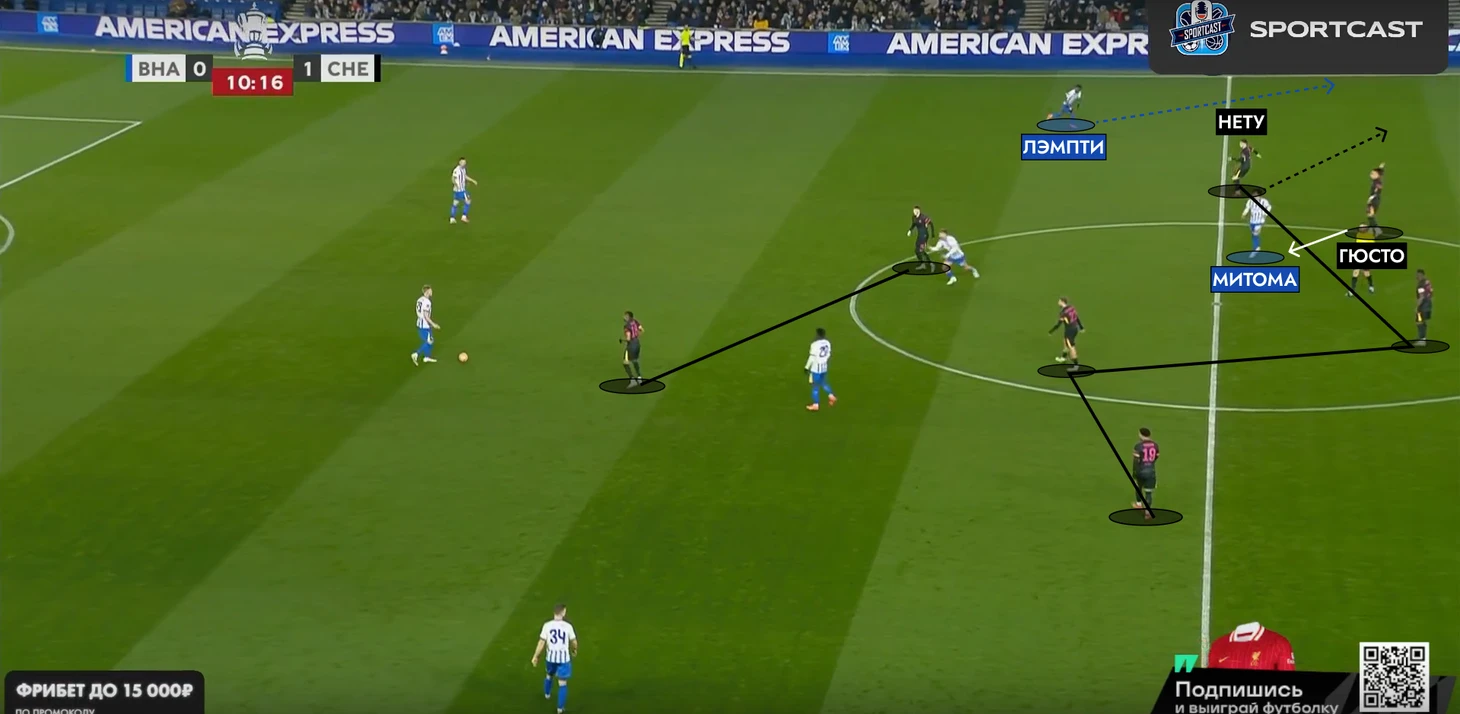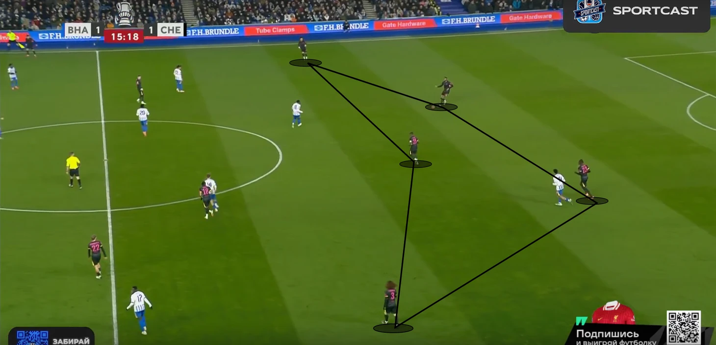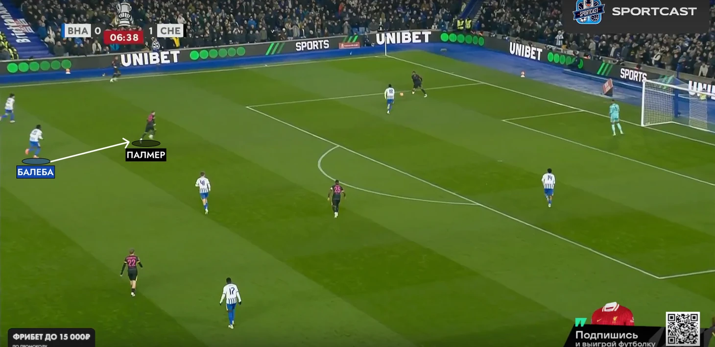 Ранний гол «Челси» не выходил из системный структуры, но был связан напрямую с хорошим выходом из-под прессинга. «Синие» не использовали инвертированную роль одного из фуллбеков в ранней стадии атаки, предпочитая розыгрыш с помощью широких краев. На это «Брайтон» отвечал высоким прессингом вингеров – Митома и Минте играли по Гюсто и Кукурелье. В опорной зоне оставался один Кайседо, и на помощь к нему подключались Палмер и Дьюзбери-Холл.