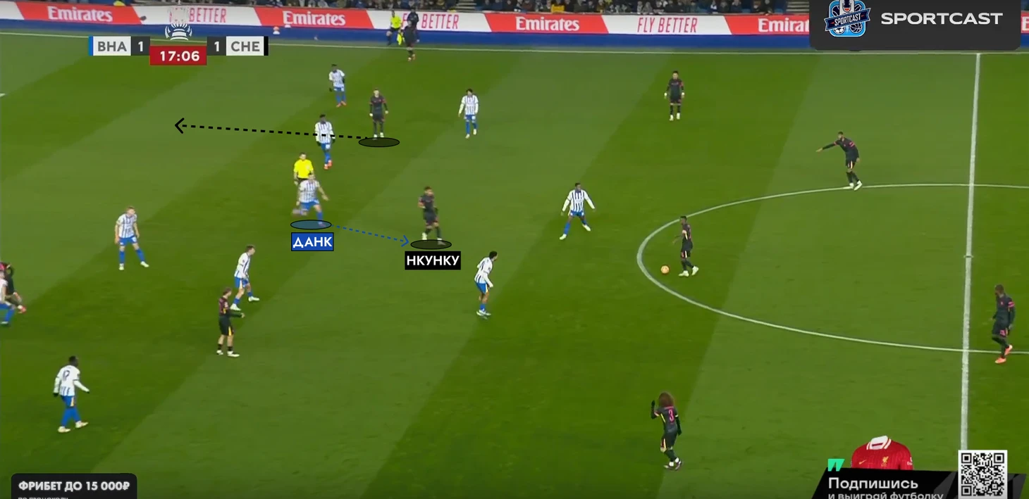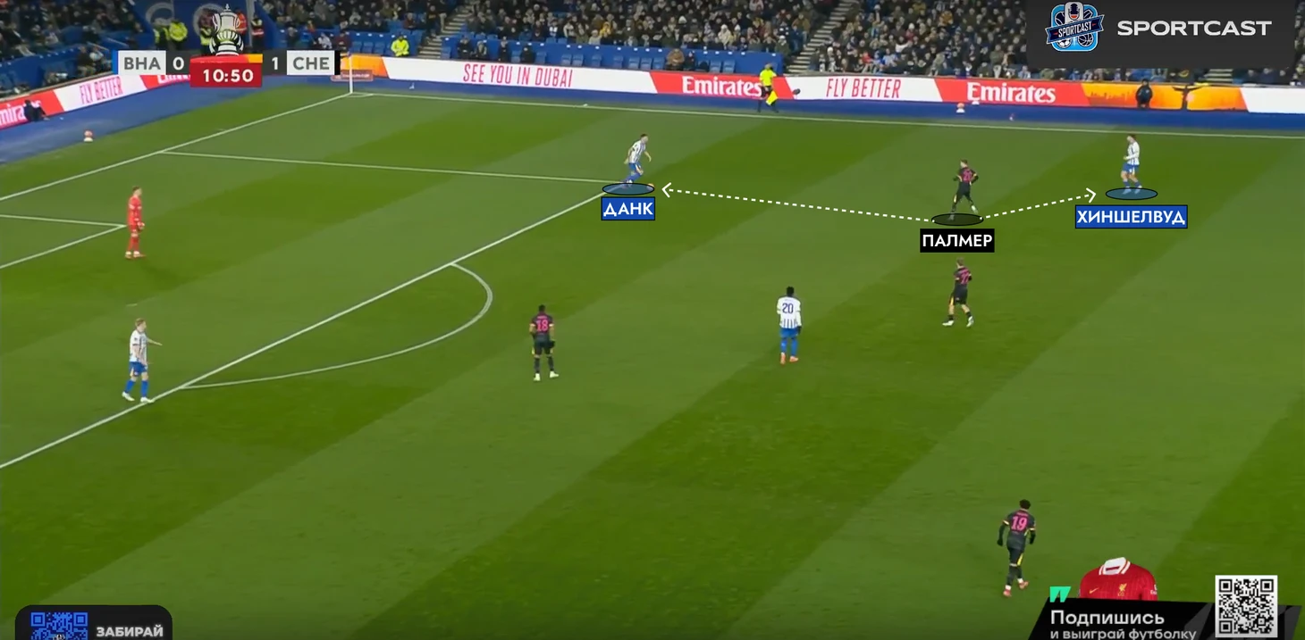Один из опорников «чаек» Балеба играл по КДХ, а Хиншелвуд шел в более активную позицию, прессингуя Мойзеса Кайседо. Мы помним, что на помощь эквадорцу опускался еще и Палмер, и поэтому «Брайтону» пришлось пожертвовать численным превосходством в защите, отправив вперед Данка.