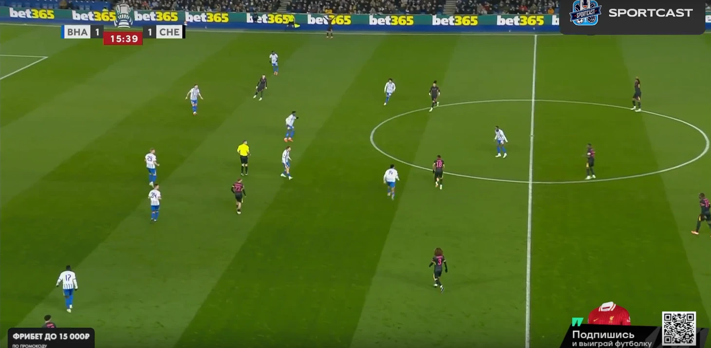 Подопечные Энцо Марески играли в позиционной атаке с довольно новой идеей – фуллбеки поднимались на одну линию с Кайседо, образуя билдап «2+3». Да, такой ход давал преимущество против первой линии прессинга «Брайтона» (иногда Митома выдергивался из своей линии, образуя тройку впереди), но совсем не давал никакого импакта, плюса, преимущества в атаке «Челси».