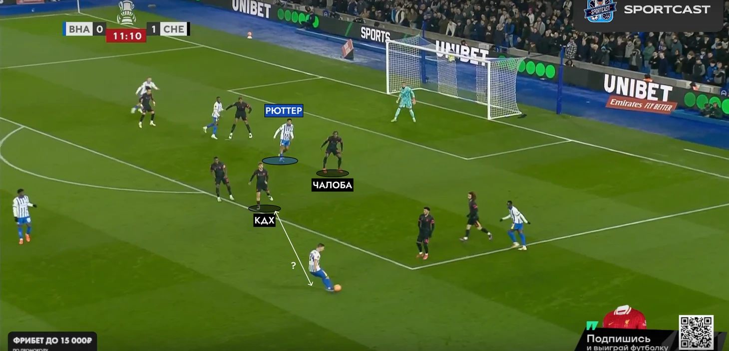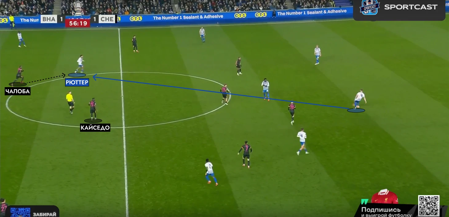 Игроки «Челси» слишком активно пошли в прессинг средним блогом, создавая пространство между линий. Естественно, нападающие «Брайтона» будут подключаться в центр, ведь пространства для приема будет много. Так и сделал Рюттер. Отмечу, что за форвардом выдернулся Чалоба, которого француз спокойно прошел.