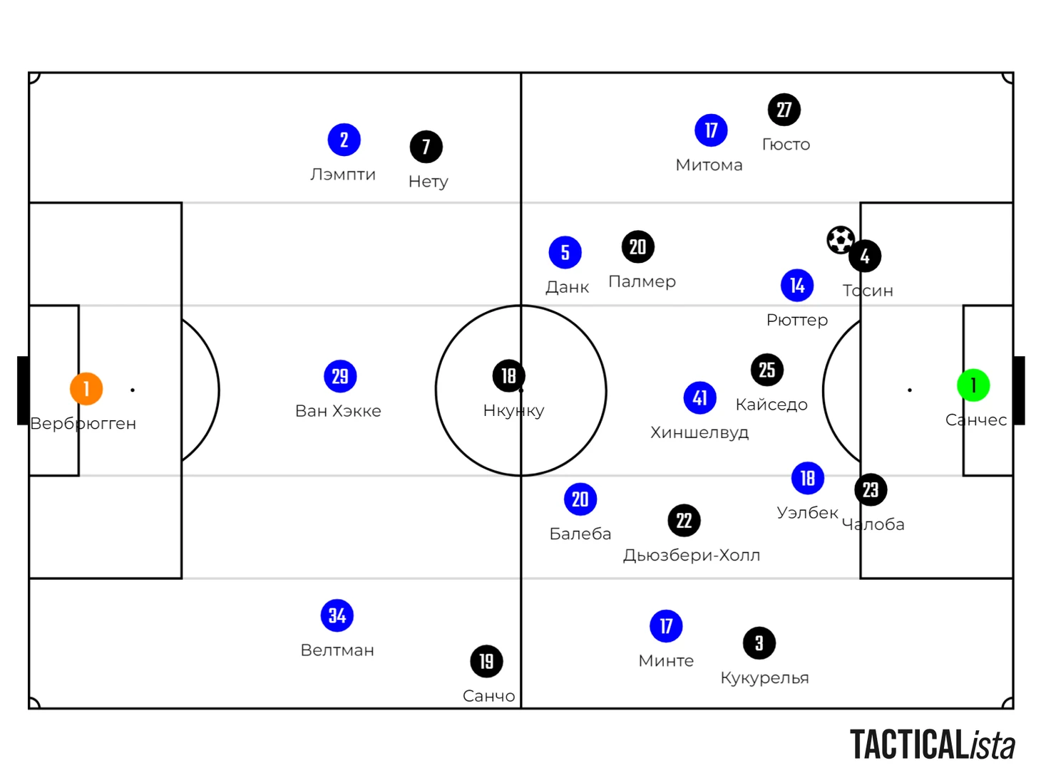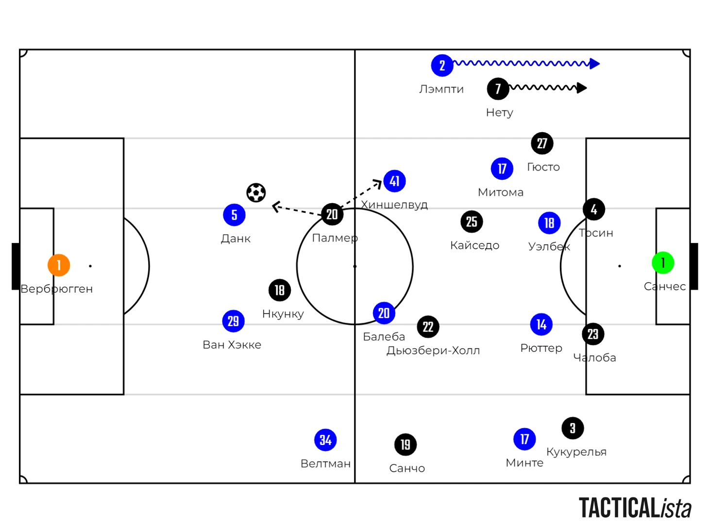 Также, заметна «рваность» схемы, напоминающая «4-1-3-2», где Кирнан Дьюзбери-Холл помогал в прессинге, оказывая давление на опорную зону «чаек», а Кайседо страховал глубину, реагируя на подключение футболистов из группы атаки. Разный функционал был заметен и в атакующей линии – Нкунку дейстовал сугубо впереди, играя по мячу, а Палмер был в «полупозиции», играя по Хиншелвуду и защитной линии.