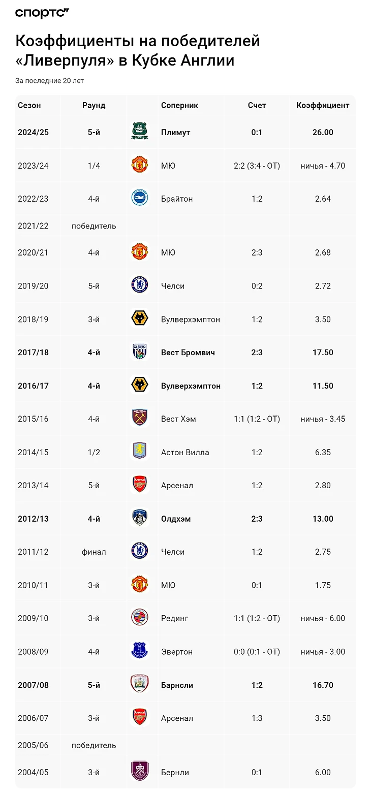 Как мы уже говорили, вероятность поражения «Ливерпуля» от «Плимута» в 2025-м подрастала до 8%, но изначально составляла всего 2-4%, что заметно отличается от других вылетов «Ливерпуля», где изменения в сравнении с первоначальными коэффициентами были незначительными.