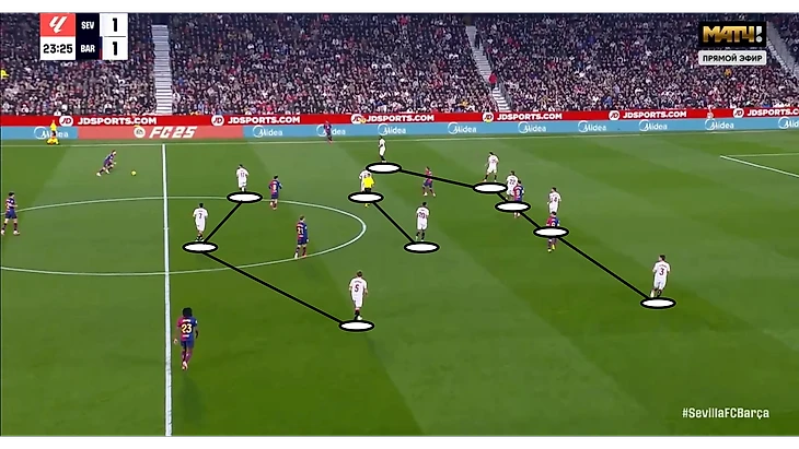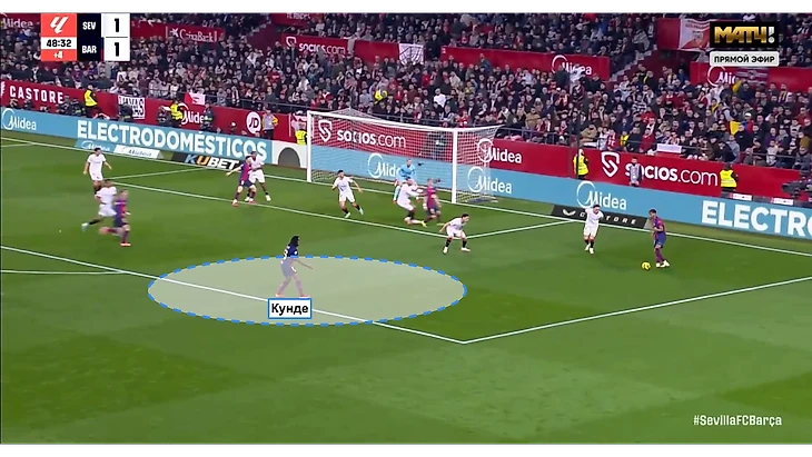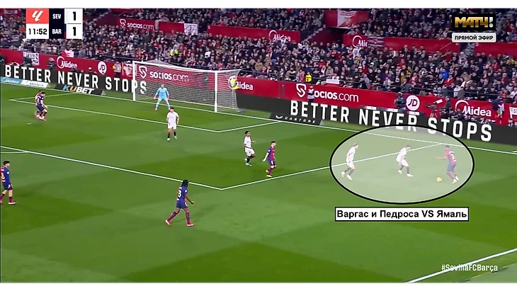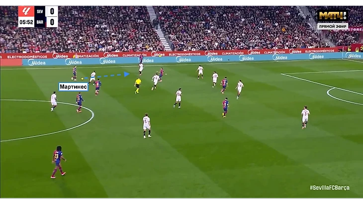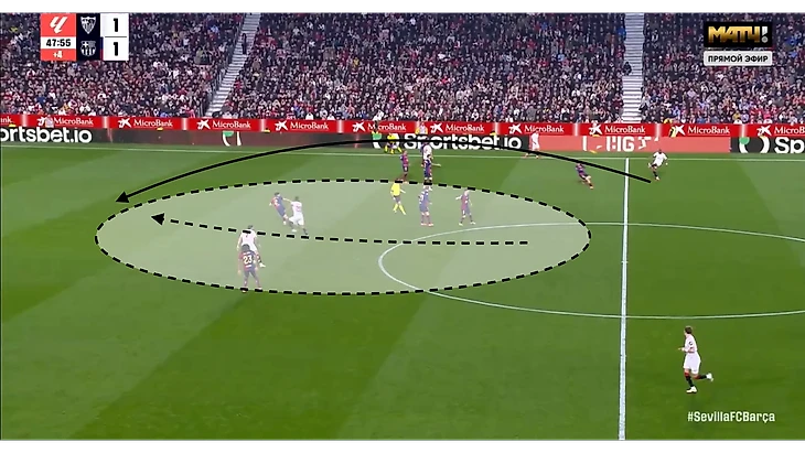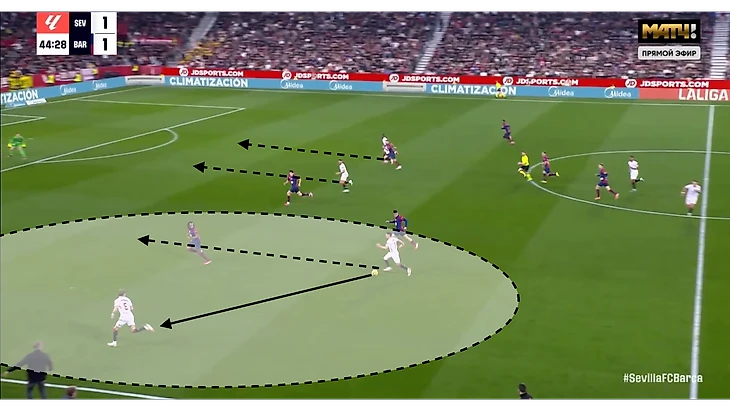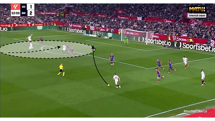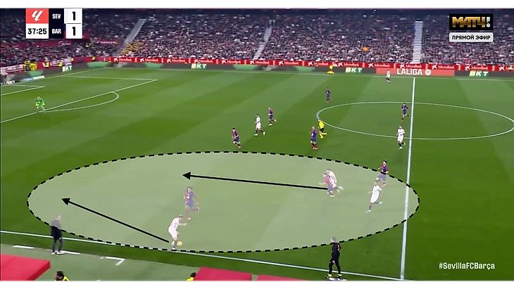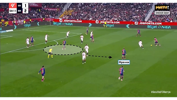 То же самое происходит и с Френки. Однако его успевает накрыть соперник, что приводит к потере мяча и быстрой атаке «Севильи» по правому флангу.