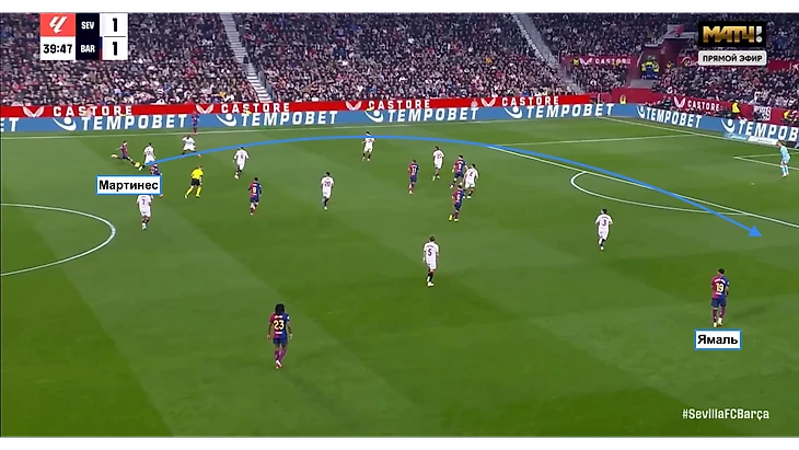 Здесь мы видим, что Мартинес самостоятельно делает перевод на Ямаля. Также здесь мы сразу можем обратить внимание на открывание Гави в канале между центральным и крайним защитниками соперника.