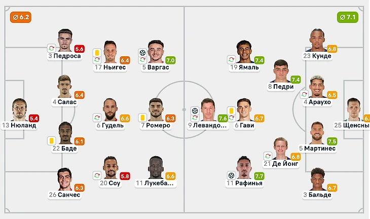 Ханси Флик внёс изменения в состав из кубковой встречи. В центре обороны вышли играть Мартинес и Араухо. В центре атаки с первых минут расположился Левандовски, а под ним — Гави. Всего на четырёх позициях произошла ротация.