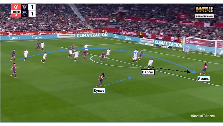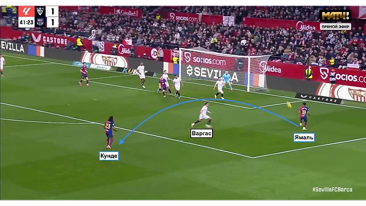 Здесь уже Варгас располагается ниже, чтобы по передаче контролировать Ямаля и своевременно создать ему сопротивление.