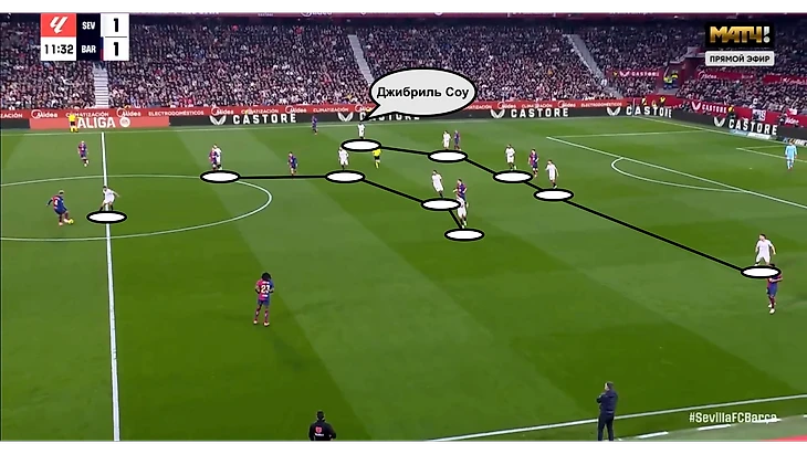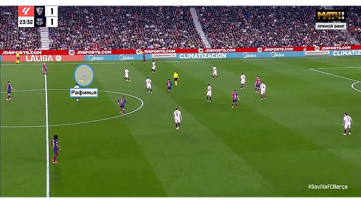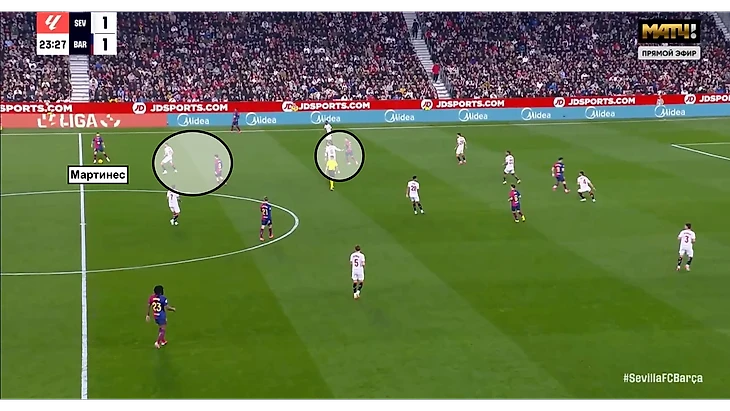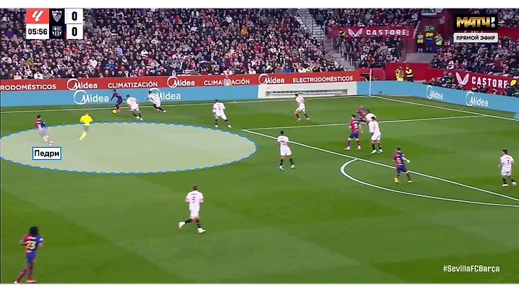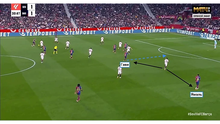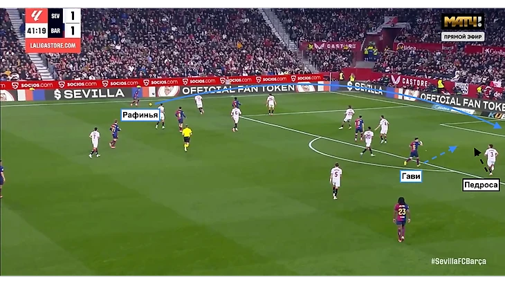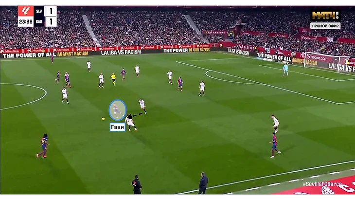 Гави также получает мяч, будучи перед линией полузащиты «Севильи». Оппонент не даёт ему развернуться и выдавливает из зоны.