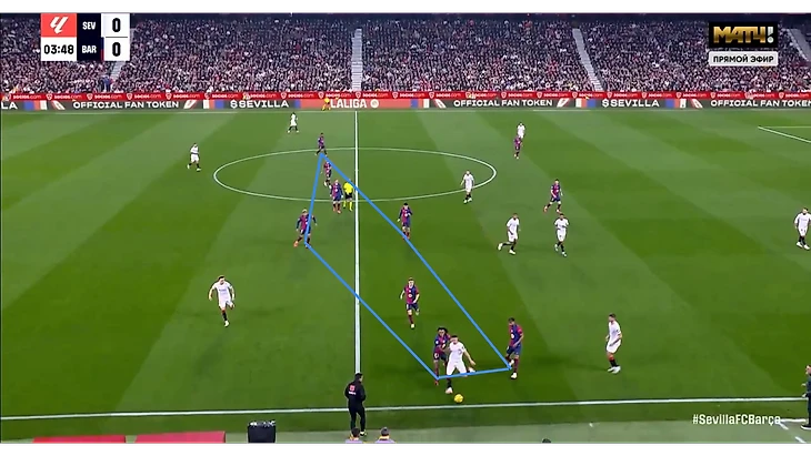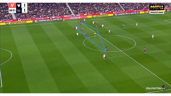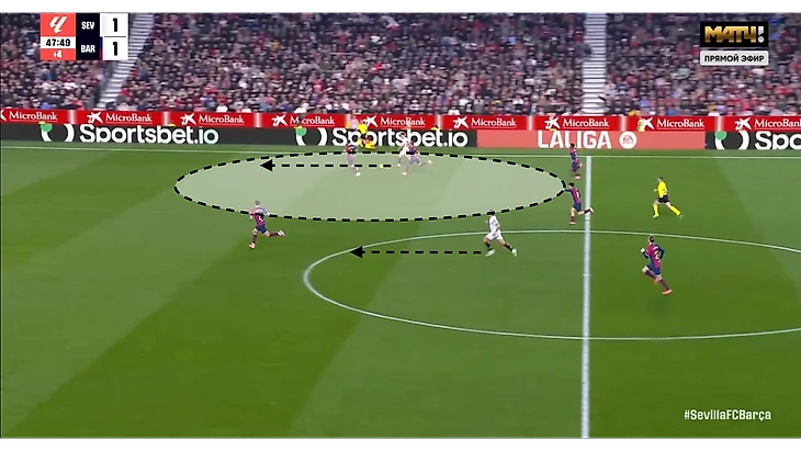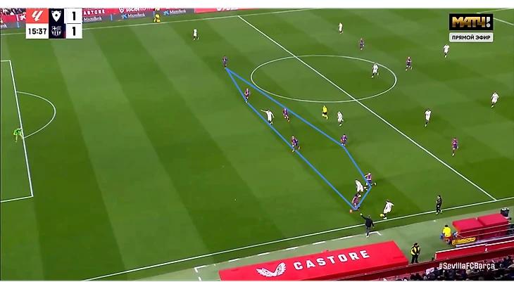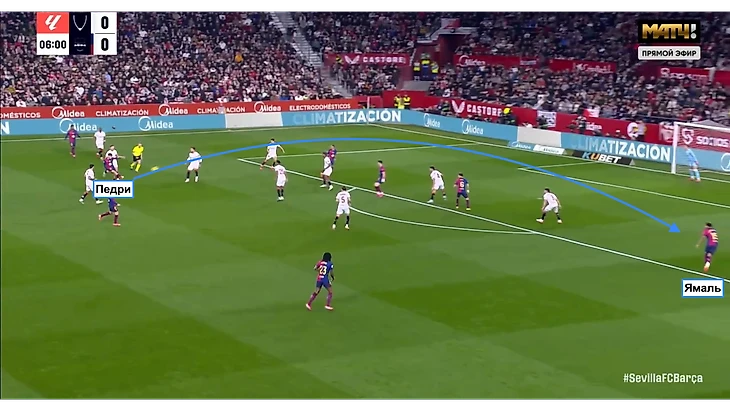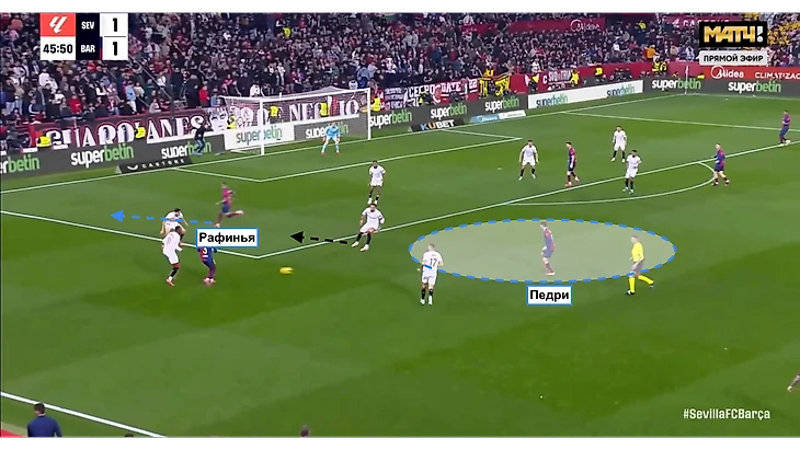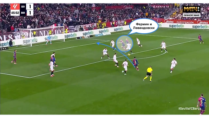 Он принимает мяч и забрасывает его в штрафную. Там мы можем наблюдать вбегание теперь уже Фермина Лопеса (вышел вместо Гави) и Левандовски через зону между центральным и крайним защитником «Севильи». Полузащитник «сине-гранатовых» оказался первым на мяче и отправил его в ворота.