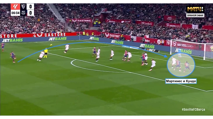 «Барса» большинство угловых в этой встрече разыграла коротко, не стал исключением и этот. Видим, что при забросе в штрафную Кунде и Мартинес нагружают дальний квадрат вблизи вратарской зоны.
