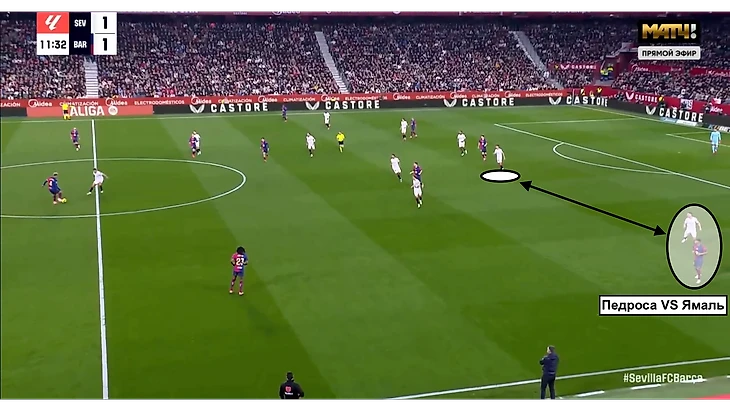 В результате этого Педроса был вынужден держать во внимании сразу двух игроков — Гави и Ямаля, так как при его широкой позиции ближе к Ламину никто не страховал пространство между ним и центральным защитником.