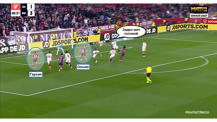 Да, мяч до Гарсии пришёл не без помощи рикошета от игрока соперника. Вероятно, если бы оппонент не сыграл головой, мяч принял бы Ольмо, что было бы не менее опасно.