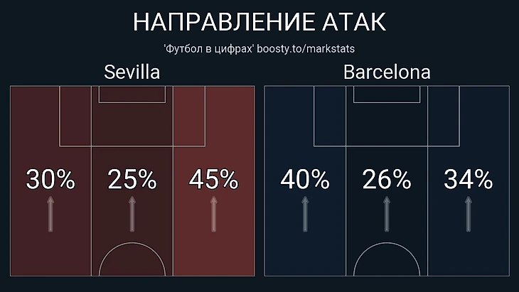 Характерной чертой атак «Севильи» была их направленность через фланги. Если обратить внимание на процентное соотношение направления атак, то можно убедиться в склонности игроков двигать мяч по флангам, в особенности через правый край поля.
