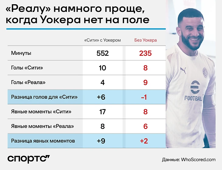 Ответом на второй вопрос всегда шел Кайл Уокер. Сейчас Кайла нет – ночной кошмар Винисиуса сбежал посреди сезона в «Милан». Важность Уокера для матчей с «Реалом» невозможно переоценить. Идеально ее характеризует табличка: