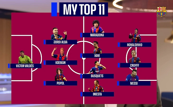 Атака: «Впереди будут Йохан Кройфф, Месси и Роналдиньо. Месси – лучший футболист в истории, Роналдиньо дарил радость и свой особый стиль, а Кройфф – кумир для фанатов «Барсы» и всех футбольных болельщиков».