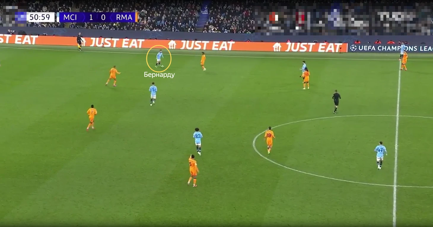 Очень часто блок из защитников «Сити» сохранял владение в начальной стадии атаки, но не давал необходимого продвижения. Часто для помощи опускались игроки на флангах, так как через центр двигать мяч не очень получалось. Здесь по ходу одной атаки для помощи в продвижении на края опускались Де Брюйне (справа) и Бернарду (слева).