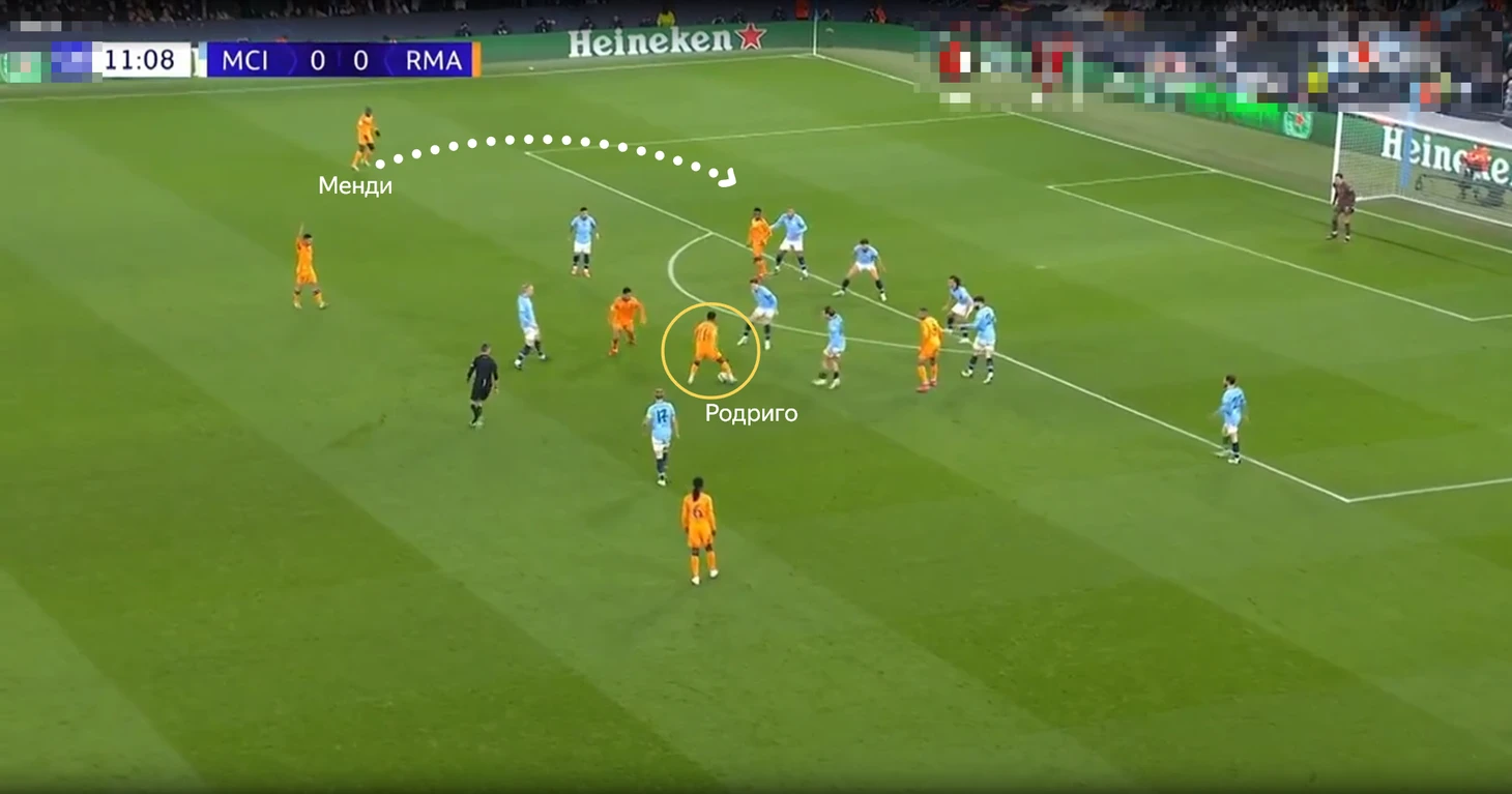 Даже пятёрка защитников не помогла команде Пепа предотвратить проблемы в обороне. Например, здесь плотность игроков обороны никак не помогла перекрыть передачу Родриго и рывок Менди в свободное пространство.