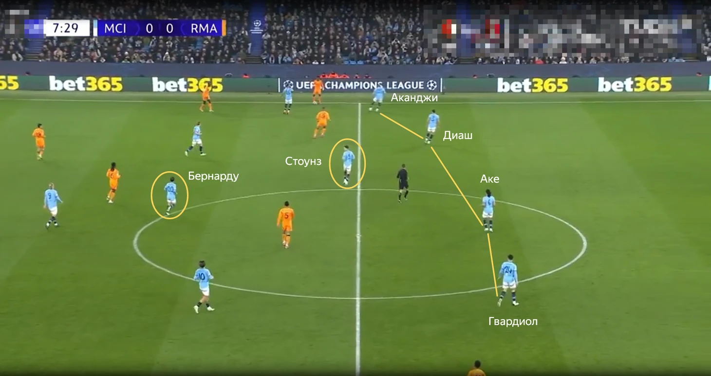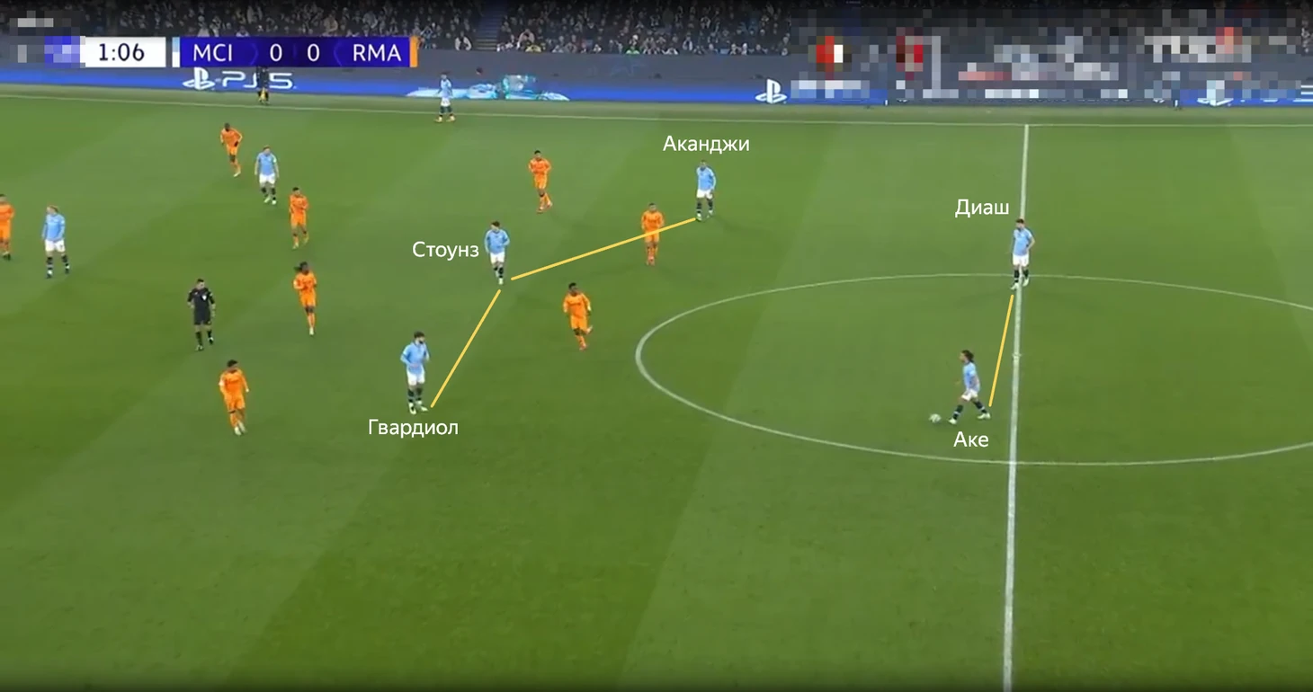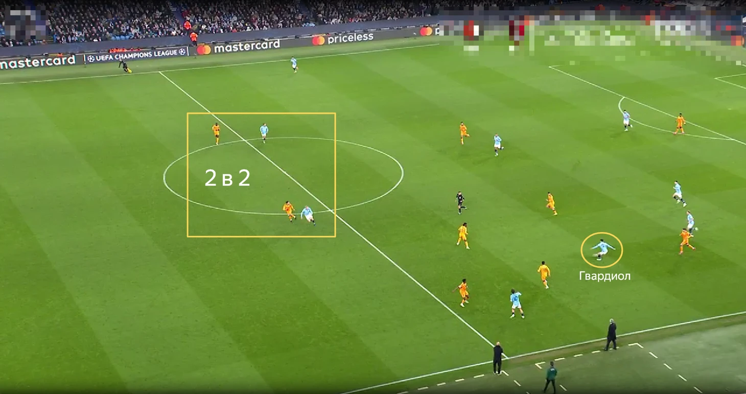 Во время владения структура трансформировалась: Аканджи и Гвардиол поднимались в опорную зону – в начальной стадии атаки у «Сити» был блок 2+3.