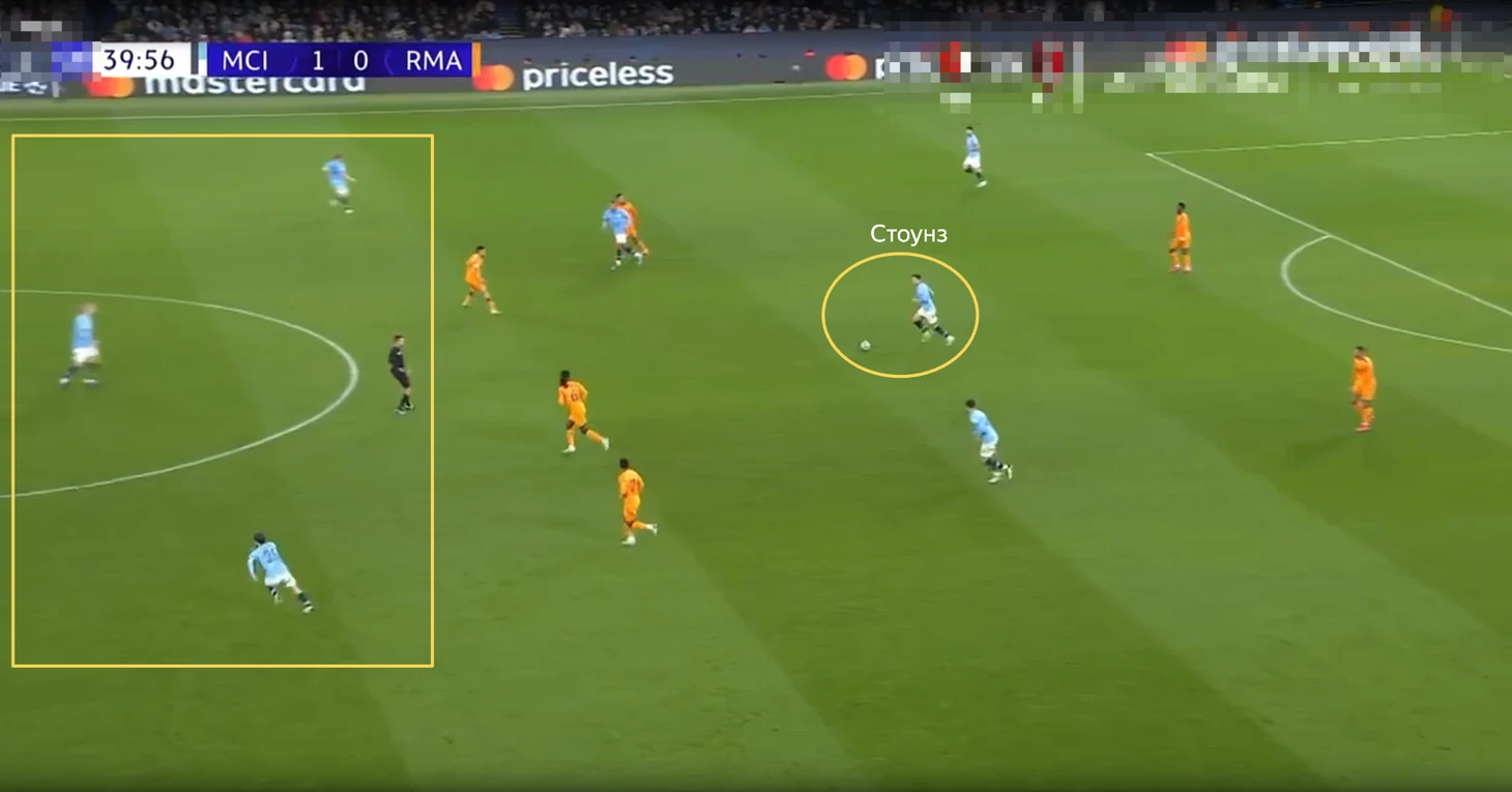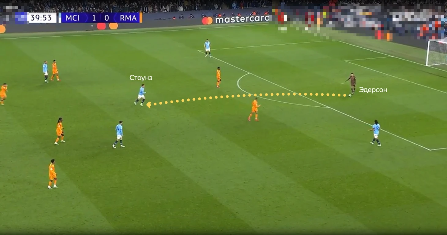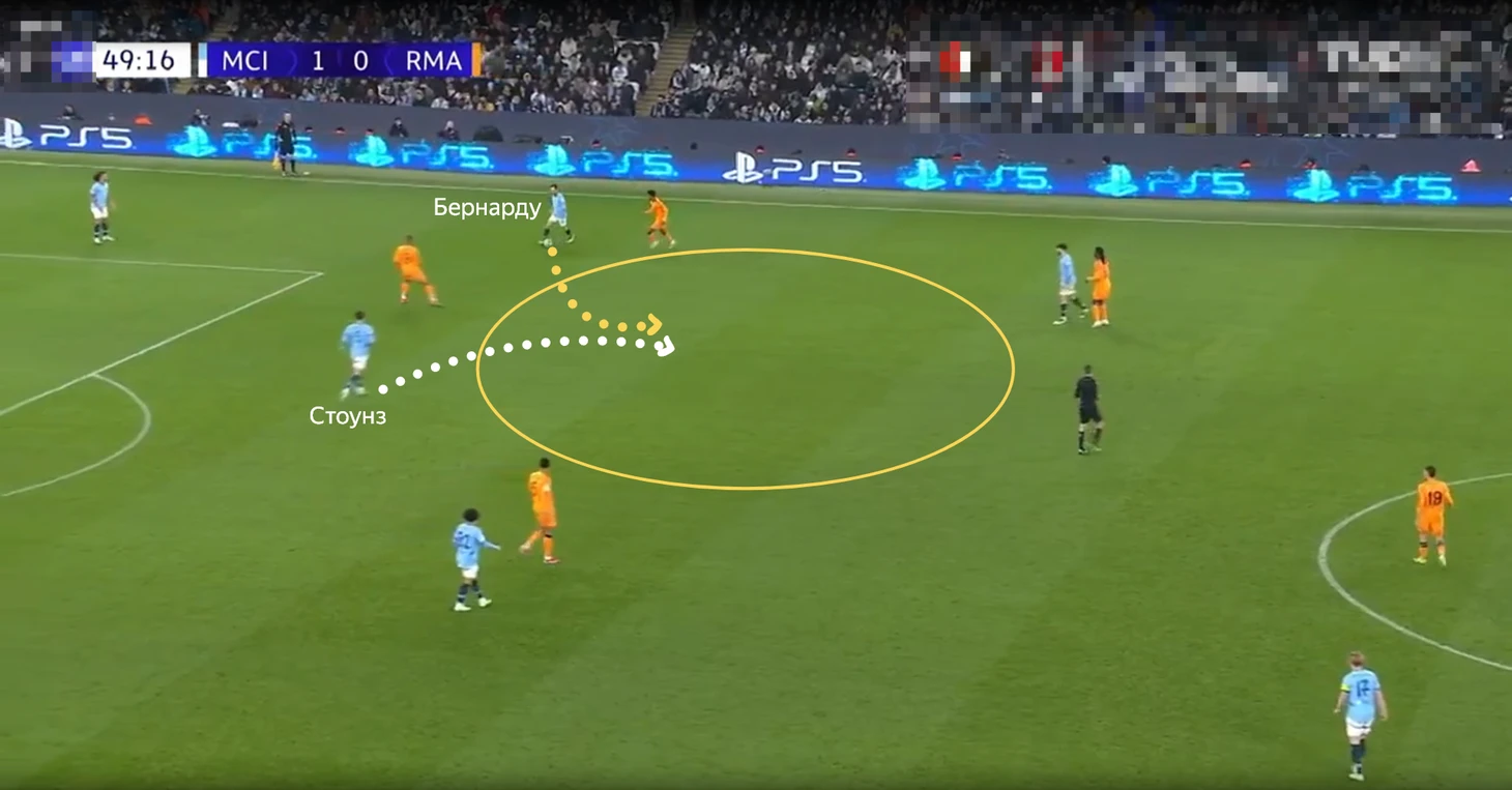 Здесь регулярно возникали проблемы. В данном эпизоде Эдерсон спокойно отдаёт передачу между Винисиусом и Мбаппе. Дальше Стоунз получает свободу на мяче. При этом пара игроков «Мадрида» уже отыграна. А четвёрка полузащитников фактически также может быть обыграна, так как игрок «Сити» с мячом получает свободу, а дальше между линиями открывается сразу несколько футболистов.