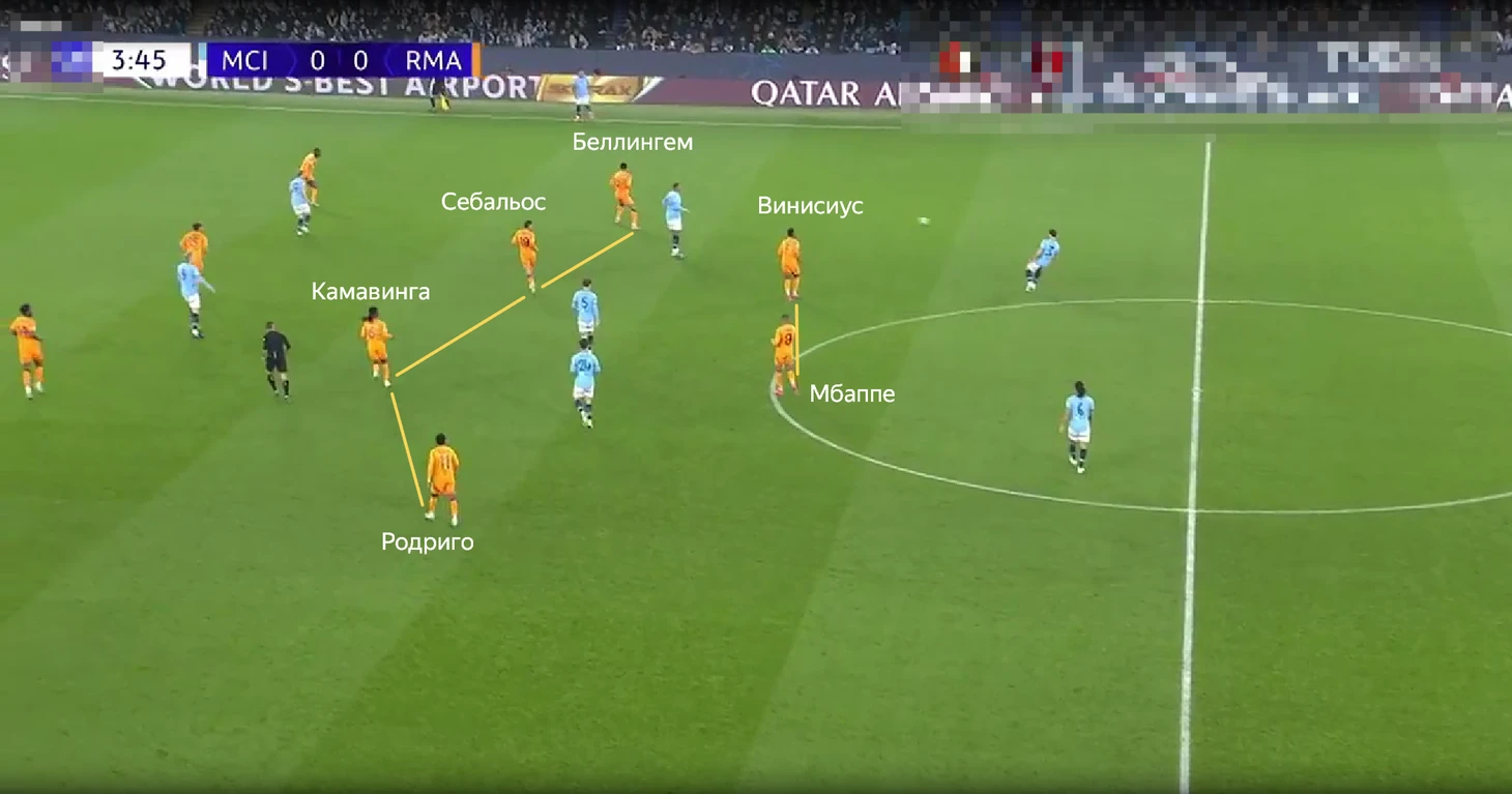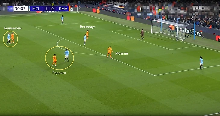 Без мяча команда действовала по схеме 4-4-2. Ожидаемо на левый фланг уходил Беллингем, а в паре с Мбаппе действовал Винисиус. При этом гости в первую очередь ориентировались на перекрытие блока 2+3 у «Сити». Из-за этого регулярно можно было наблюдать ситуации с очень узкими позициями Беллингема и Родриго.