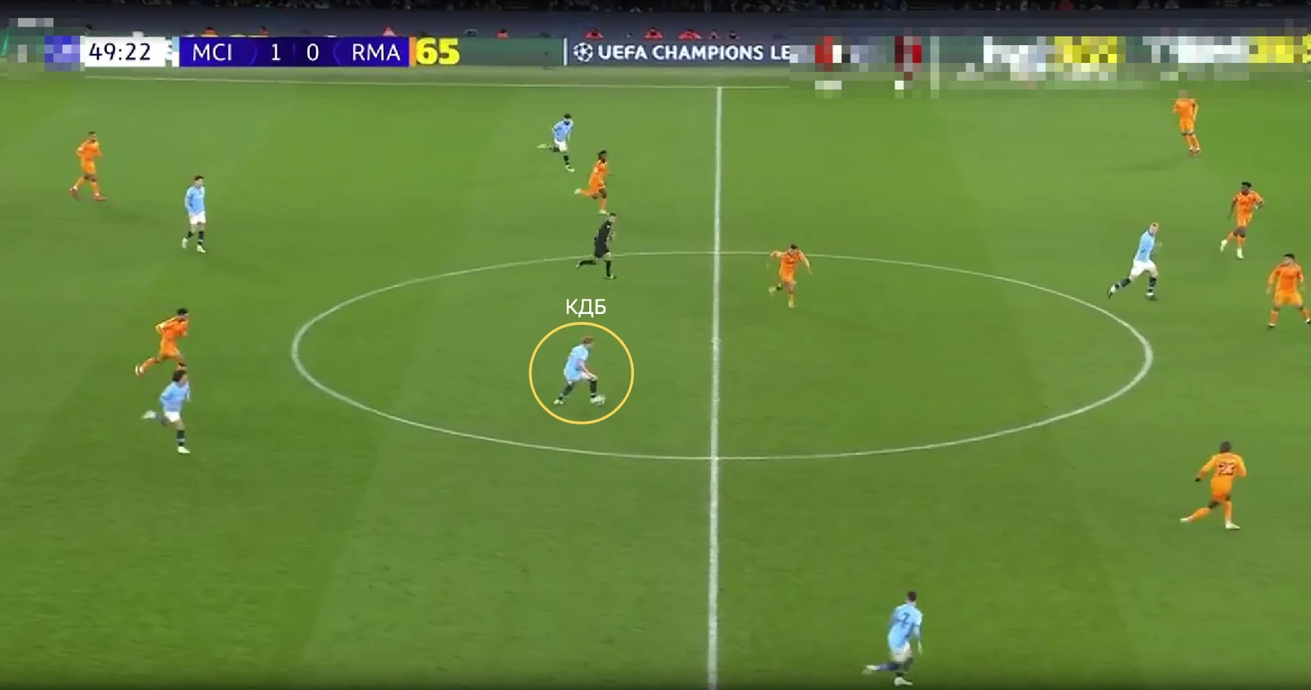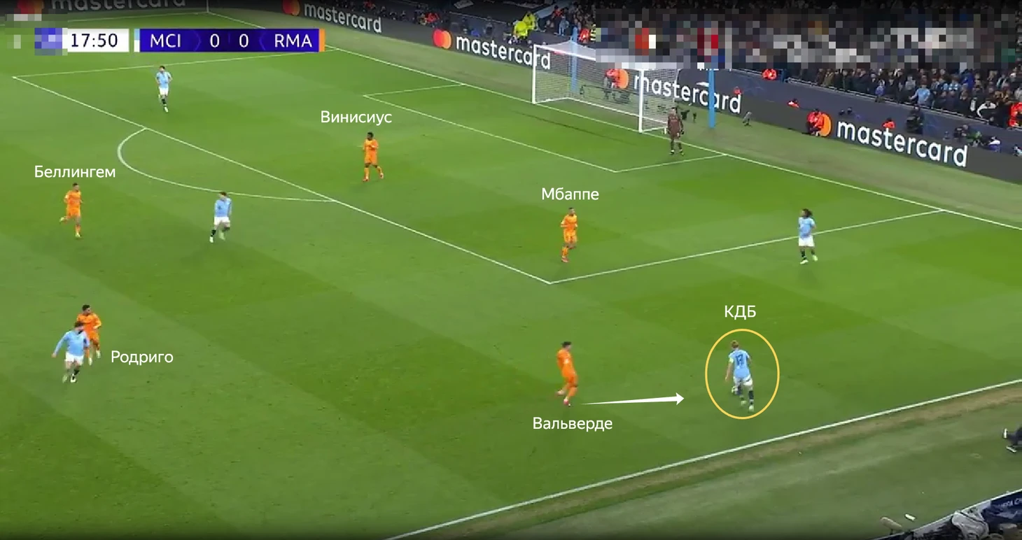 Де Брюйне опустился на фланг и вытянул на себя Вальверде, после чего мяч дошёл до Гвардиола, который получил свободу на мяче, а впереди была ситуация 2 в 2 и много свободного пространства.