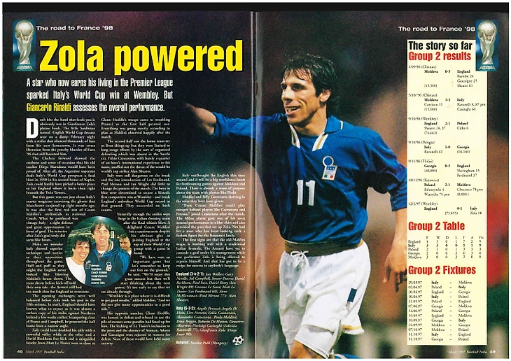 Триумфальное шествие Дзолы по просторам АПЛ не осталось незамеченным и у него на родине. Благо, Италия была в одной отборочной группе ЧМ’98 с англичанами. Арриго Сакки покинул свой пост после неудачного Евро, Национале возглавил Чезаре Мальдини и решил не следовать неписанному правилу не приглашать игроков не из Серии А. 12 февраля 1997 предстояла игра на Уэмбли и Дзола был на нее вызван.