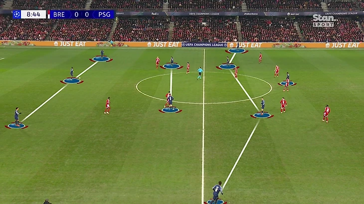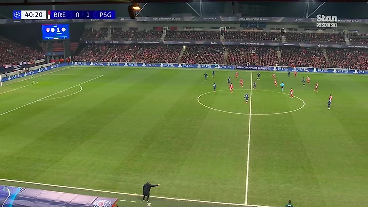 При этом в менее заготовленном давлении, когда «Бресту» нужно переходить в прессинг из среднего блока, команда не так хороша. Поэтому в этой стадии «ПСЖ» использовал привычную структуру и традиционный стиль: