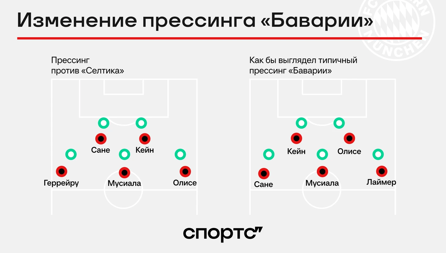 Против «Селтика» «Бавария» выбрала другой вариант. В пару к Кейну поднимался левый вингер Лерой Сане, справа прессинговал Майкл Олисе, слева выдвигался левый защитник Рафаэл Геррейру.