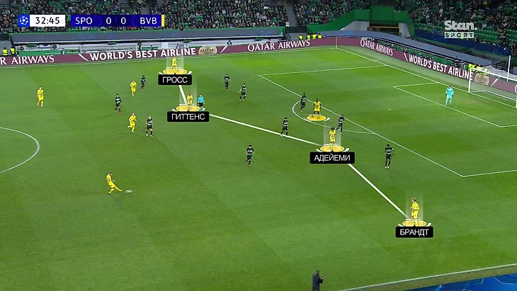 Расположение максимально привычное, а вот наполнение неординарное: вингеры Гиттенс и Адейеми сужаются, а фланги занимают центральные полузащитники Гросс и Брандт.