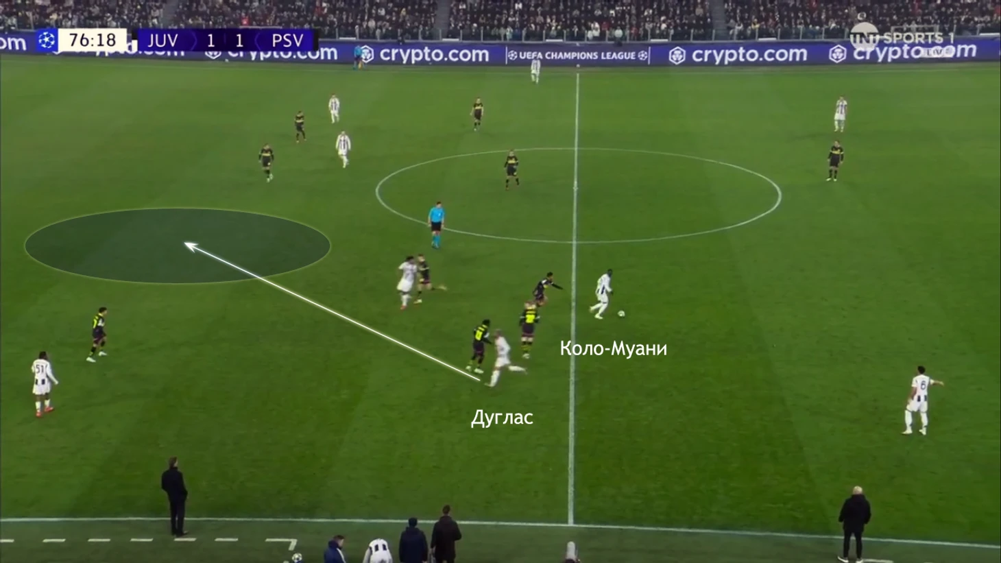 Дуглас и Тюрам отреагировали одновременным рывком – это одно из главных правил Мотты, «отдал-вбежал». Коло-Муани оказался в опорной, параллельный забег Хефрена привлек внимание и увел лишнего, и Дуглас, оказавшийся в слепой зоне, рванул в огромное опустошенное пространство между защитниками.